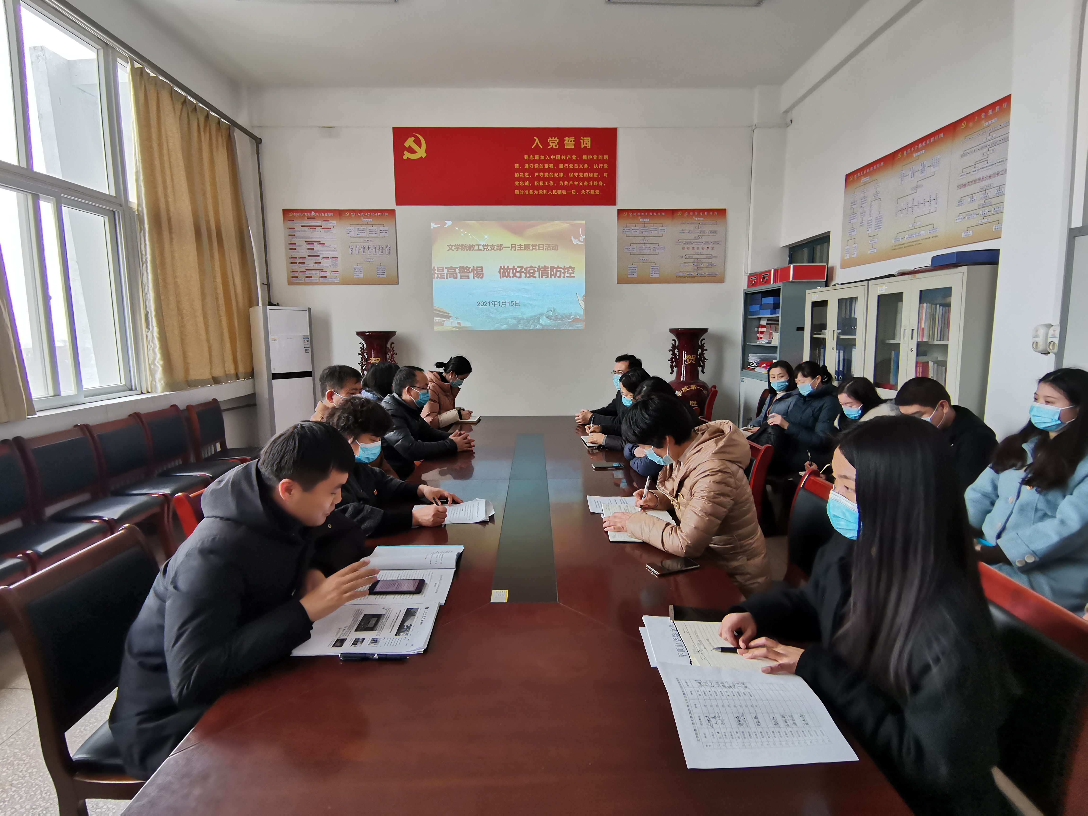 1月15日下午,教工党支部在1422党建活动室开展“疫情防控”主题党日活动。主题党日活动由教工党支部书记王惠主持。王惠带领大家学习了1月12日“全省教育系统疫情防控工作电视电话会议精神”和“公司疫情防控工作专班及相关部门负责人会议就下一阶段公司疫情防控工作进行的安排部署”,强调了加强疫情防控这根弦不能松,大家要严格遵守疫情防控纪律,做到“七个不能有”。大家集中观看学习了《科学防疫,健康过大年》《元旦、春节即将到来,可以聚会旅游了吗?新冠防疫医生有话要说》两个视频,对寒假期间如何做到科学防疫有了更加深刻的认识。