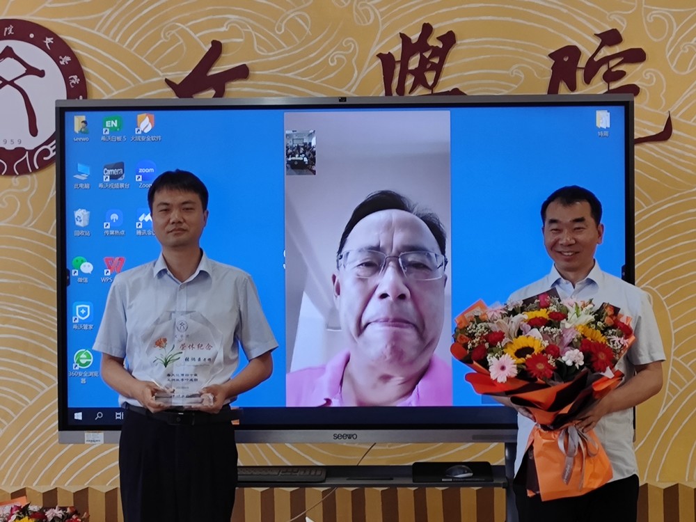 荣休仪式上,公司党委书记申自强和经理孙振杰代表公司师生为三位老师送上鲜花和荣休纪念奖杯。张炳臣老师因事不能来到现场,在场教师通过线上的方式向他表达了浓浓的难忘之情。