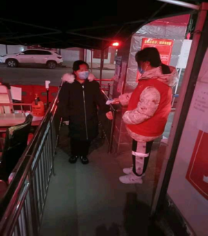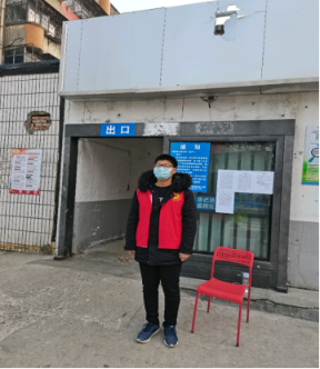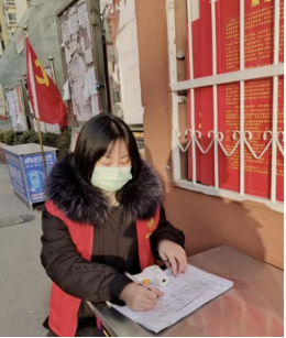 郭嘉同学作为志愿者在北关社区天宝花苑小区协助团县委进行抗疫工作,她主要负责帮助小区居民进行进出小区的扫码登记,提醒居民签写防疫承诺书和告知书,协助社区网格员采集小区内居家隔离的业主信息。