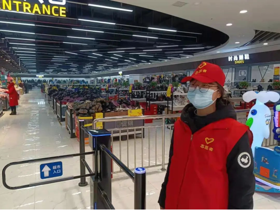 面对疫情蔓延,祈安妮同学积极参与志愿者服务工作,在超市门前检查健康码和行程码,登录人员信息,排查人员行程,确保出入超市人员的安全。