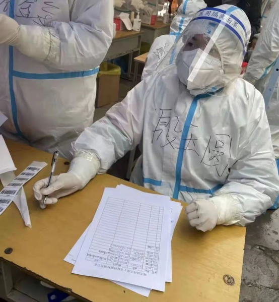疫情期间,家在河南省安阳市的彭鑫洋同学主动加入社区志愿者团队,负责协助开展核酸检测,维持现场秩序,并进行核酸检测拍照和录入信息等工作。