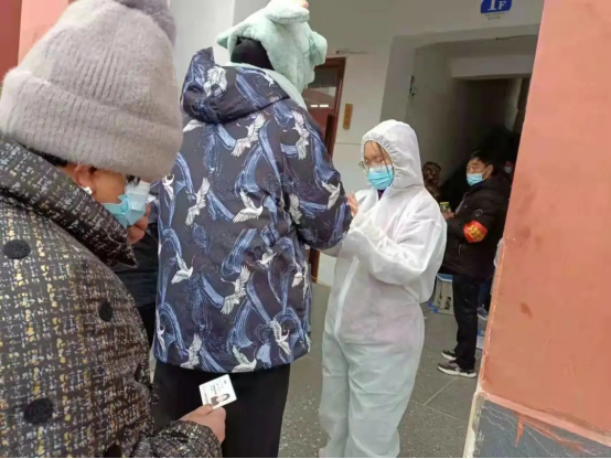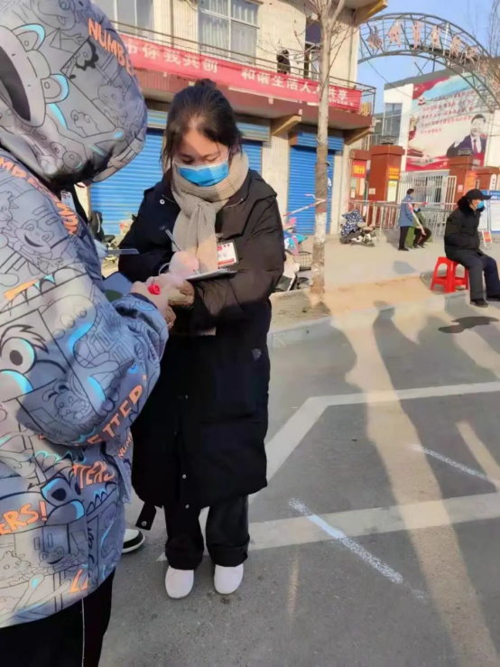 面对疫情,刘瑾同学积极投入到河南省安阳市滑县道口镇解南社区的疫情防控工作中,协助医护人员进行核酸信息采集。