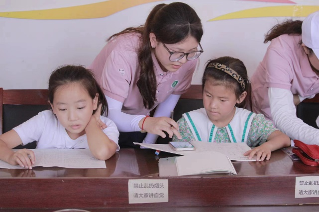 课业辅导是支教活动的一个重要环节。志愿者们或坐或站,陪在员工们身旁,检查他们暑假作业的完成质量。当员工有疑难问题时,志愿者耐心细致地解答,积极引导员工获得正确的解题方法。