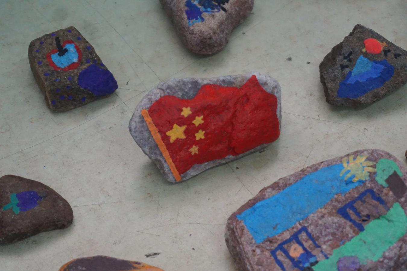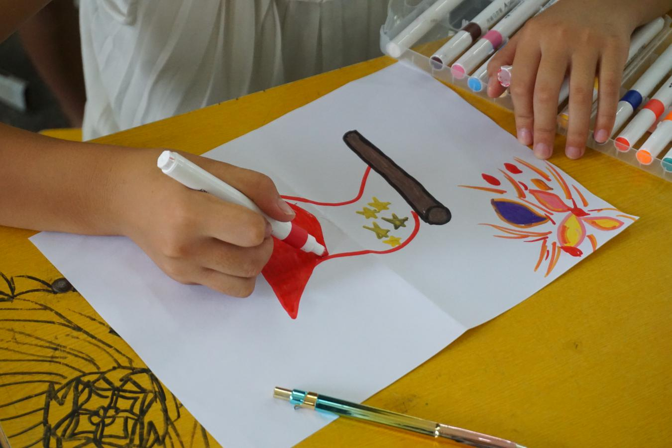 课程临近尾声,文艺支教组组长李克强精心构思,在黑板上勾勒出国旗图案轮廓,鼓励孩子们发挥创意自由创作。孩子们瞬间被点燃热情,纷纷拿起五彩斑斓的马克笔,化身小小画家投入创作。教室里,专注的眼神、灵动的笔触与此起彼伏的讨论声交织,每一笔色彩的涂抹、每一次线条的勾勒,都倾注着对祖国最纯真的热爱。
