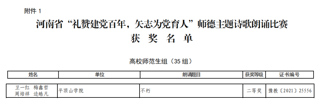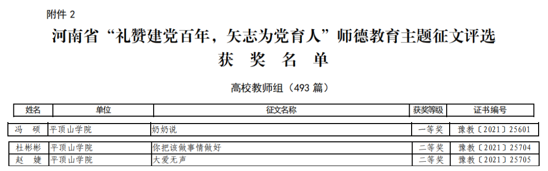 近日,河南省教育厅发布《关于公布“礼赞建党百年,矢志为党育人”诗歌朗诵比赛、师德教育主题征文和师德师风优秀案例评选结果的通知》(教师〔2021〕289 号),伟的国际1946bv官网员工卫一红、梅鑫哲、周培祥、边皓凡的《不朽》获得河南省“礼赞建党百年,矢志为党育人”诗歌朗诵比赛高校师范生组二等奖(豫教〔2021〕25556),伟的国际1946bv官网教师冯硕的《奶奶说》(豫教〔2021〕25601)获得河南省“礼赞建党百年,矢志为党育人”师德教育主题征文高校教师组一等奖,杜彬彬的《你把该做的事情做好》(豫教〔2021〕25704)、赵婕的《大爱无声》(豫教〔2021〕25705 )获得二等奖。