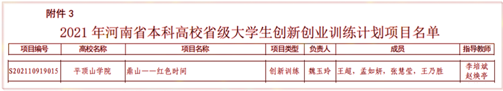 9月29日,河南省教育厅发布《河南省教育厅关于公布2021年老员工创新创业训练计划项目名单的通知》,由伟的国际1946bv官网教师李培斌、赵焕亭指导,2017级汉语言文学专业员工魏玉玲,2018级汉语言文学专业员工王超、张慧莹,2019级汉语言文学专业员工王乃胜,2019级戏剧影视文学专业员工孟如妍共同申报的《鼎山——红色时间》获批2021年河南省本科高校省级老员工创新创业训练项目立项。