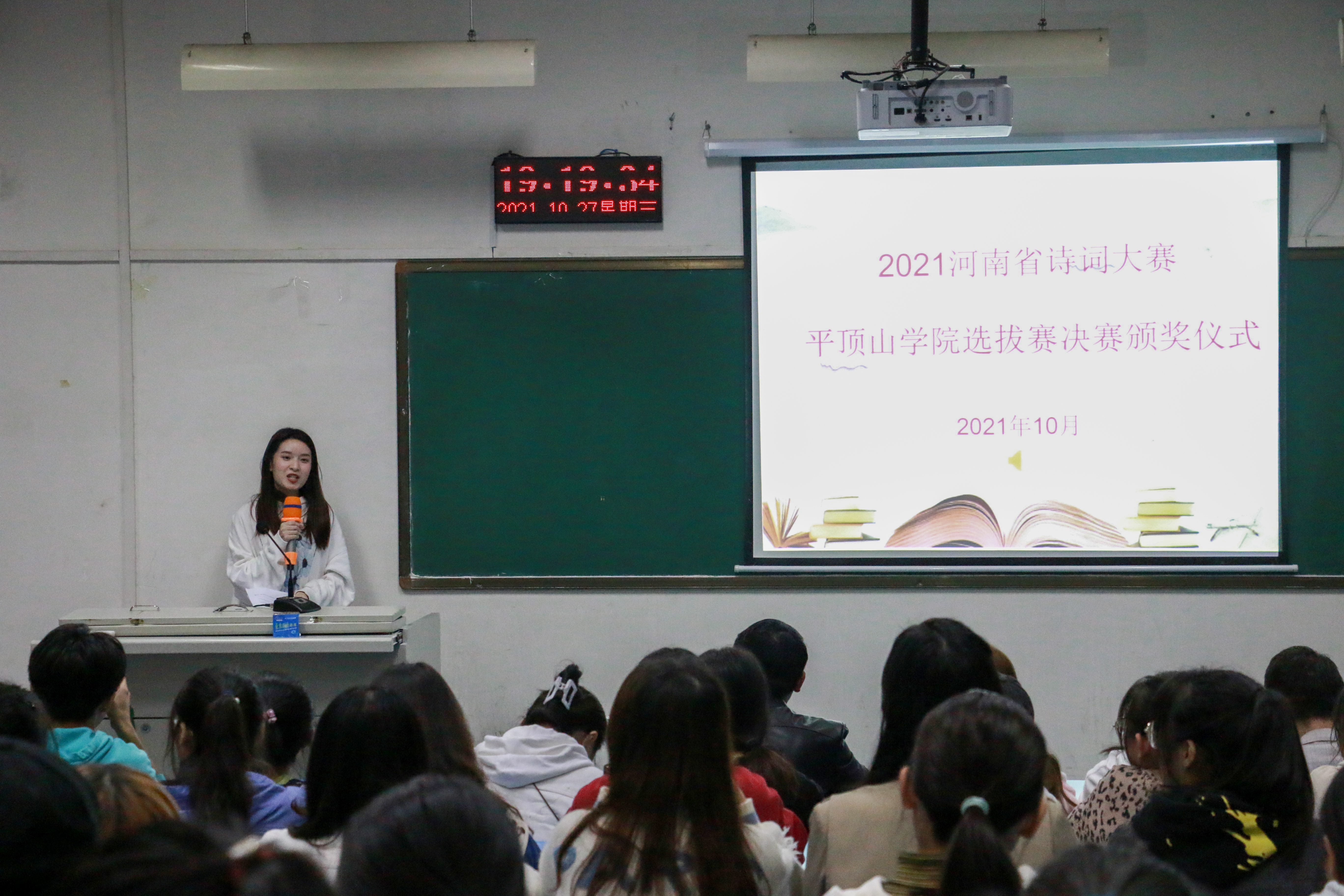 10月27日晚,由公司举办的2021河南省诗词大赛伟德国际victor1946官网选拔赛颁奖典礼暨省赛一等奖选手王镜婷参赛经验分享会在1306教室举行。伟的国际1946bv官网经理孙振杰、副经理赵焕亭、文学教研室古代文学教师及2021级新生100多人参加活动。活动由伟德国际victor1946官网微光文化工作室成员主持。