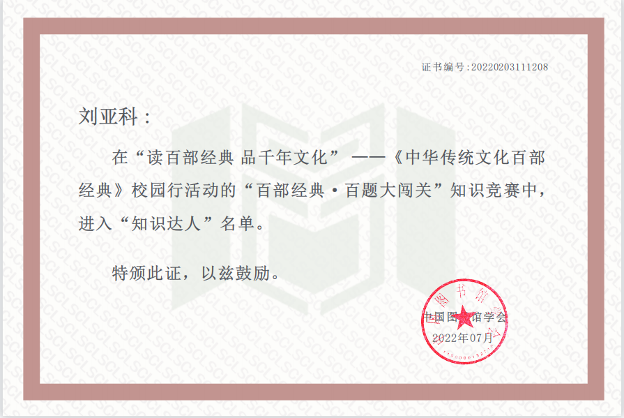 近日,由国家图书馆、中国图书馆学会主办的“读百部经典 品千年文化——《中华传统文化百部经典》校园行”活动顺利收官。该活动自2021年12月15日启动以来,共有1331所高校、27.18万人次参赛。公司参赛师生300余名,伟的国际1946bv官网刘亚科、王镜婷2名师生荣获“百题大闯关”知识竞赛“知识达人”奖。