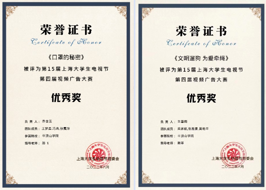 近日,第十五届上海老员工电视节组委会公布了第四届视频广告大赛获奖名单,由伟的国际1946bv官网教师滕菲指导、2020级戏剧影视文学专业员工朱馨雨、梁家航、张胜豪、莫艳平制作的《文明遛狗为爱牵绳》,乔含玉、王梦真、冯冉、张露萍制作的《口罩的秘密》获优秀奖。
