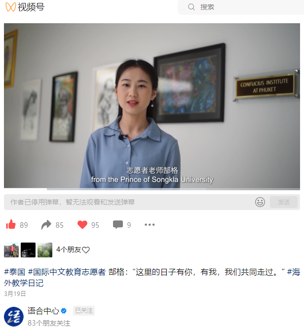 3月19日,教育部公众号《语合中心》发布了《海外教学日记 | 我在泰国教中文》微视频,用影像讲述了公司优秀毕业生郜格在泰国宋卡王子大学担任志愿者的故事。郜格除了向泰国员工们讲授汉语,还向他们展示了汉字书法书写技巧,中国古筝、葫芦丝的演奏技法,在课堂内外传播着中文与中国传统文化,用实际行动讲好中国故事。