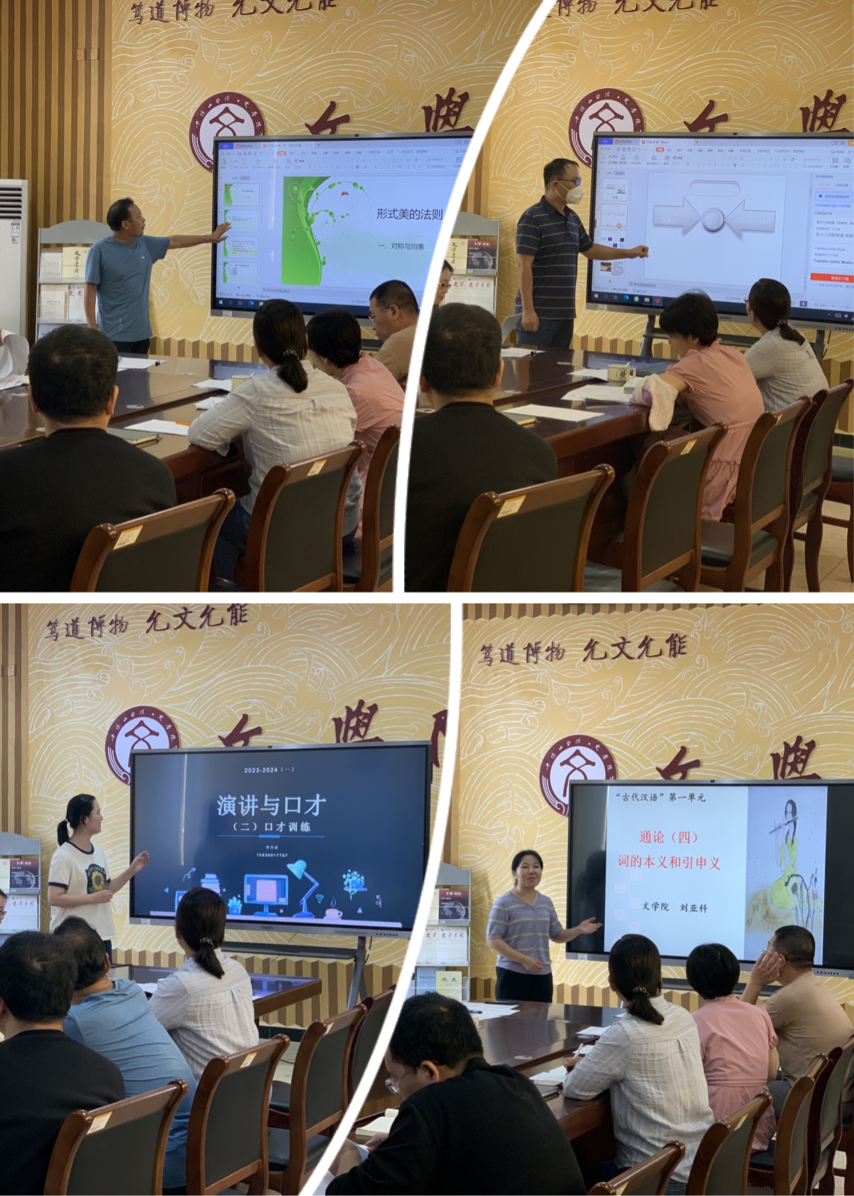 按照事先排好的次序,高冠琳、徐燕、岳上铧、刘亚科、朱凯歌、卢淑芳、刘徐莹、王惠、张焕玲、赵星、李东晓、杜彬彬、李丹阳、毋小利、沈喜阳、刘春萍16位老师依次展示了自己的课程,涉及专业主干课,专业选修课,内容包括《艺术的特征》《外国戏剧史》《古代汉语中字意的发展和引申》《学术问题的发现》《人工智能文学创作及其问题》等。授课教师精心准备,充分发挥,从课程内容出发,有的进行说课,有的展示讲授过程,有的说课讲课并举,有的模拟课堂发起探讨,教学方法多样,教态仪表大方自然,充分展示了公司教师的教学水平。