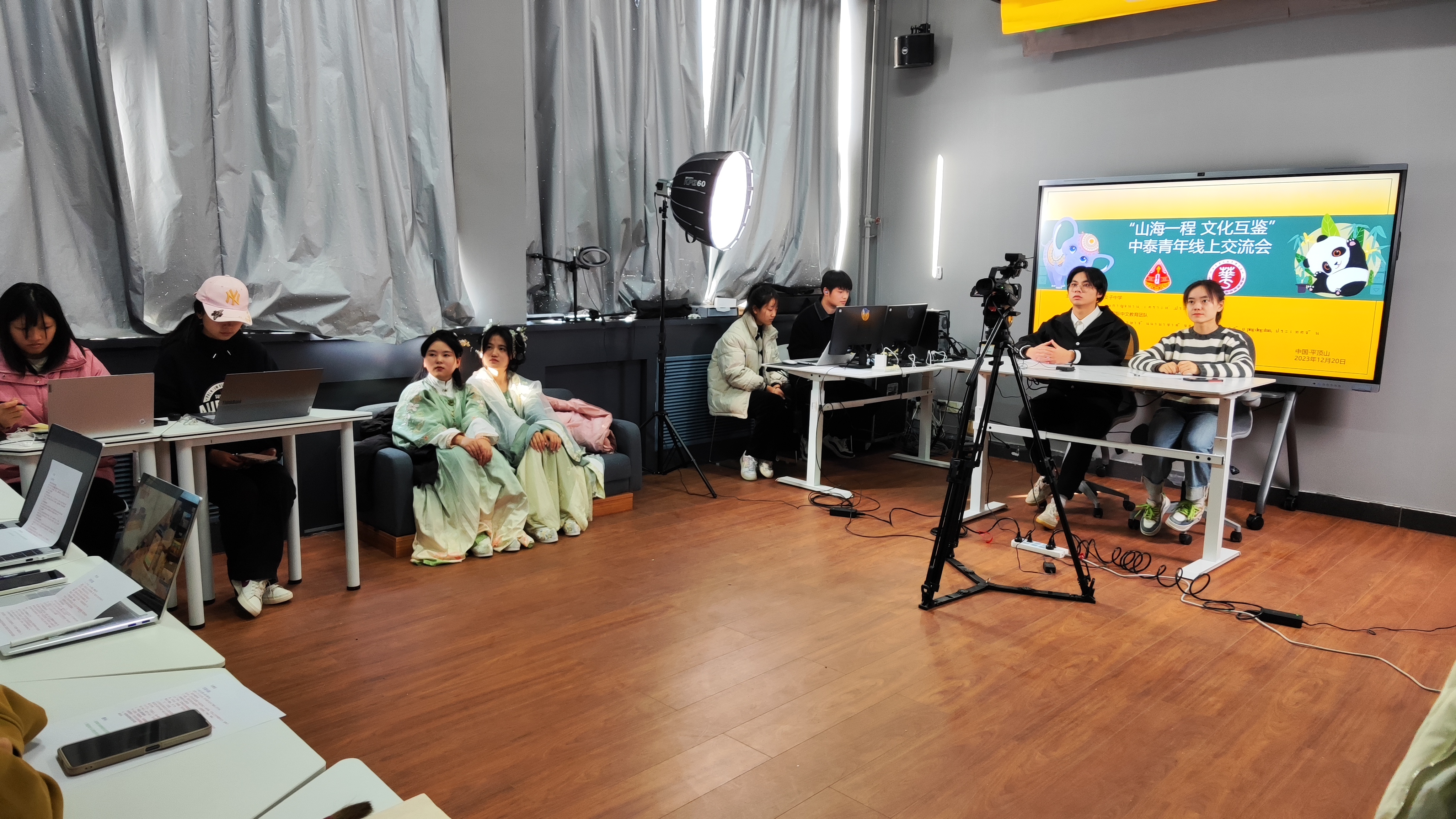 文明因交流而多彩,文化因互鉴而丰富。北京时间2023年12月21日14时,公司在国际中文教育实训室举办“山水一程 文化互鉴”中泰青年线上交流会。泰国干乍娜女子中学教师代表冯清美、陈星、李佳佳,来自中国的汉语教师桑裕璎,该校高三员工,公司语言教研室教师代表卢淑芳、李丹阳,国际中文教育团队成员100余人共同参加此次活动。此次交流会分主会场及外景分会场,由2021级汉语国际教育专业夏怡晴、2022级英语专业叶阳峰两位同学主持。本次活动全程由公司国际中文教育团队青鸢工作室承办。