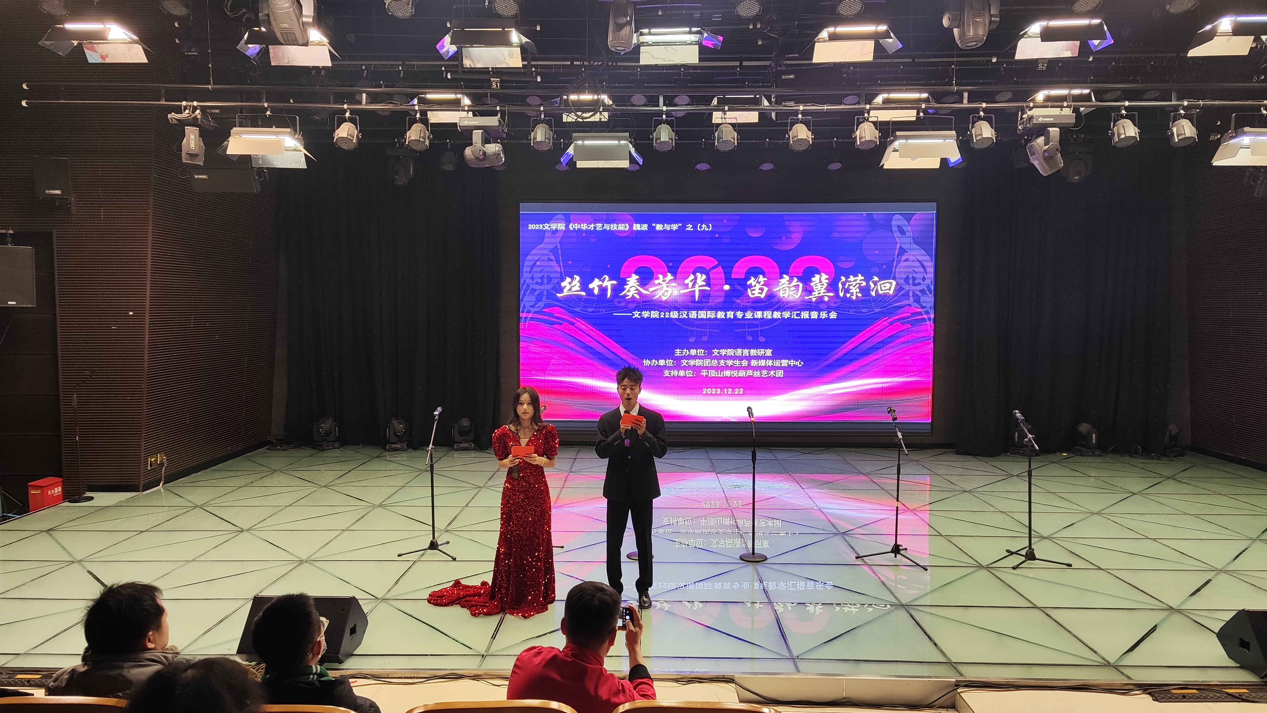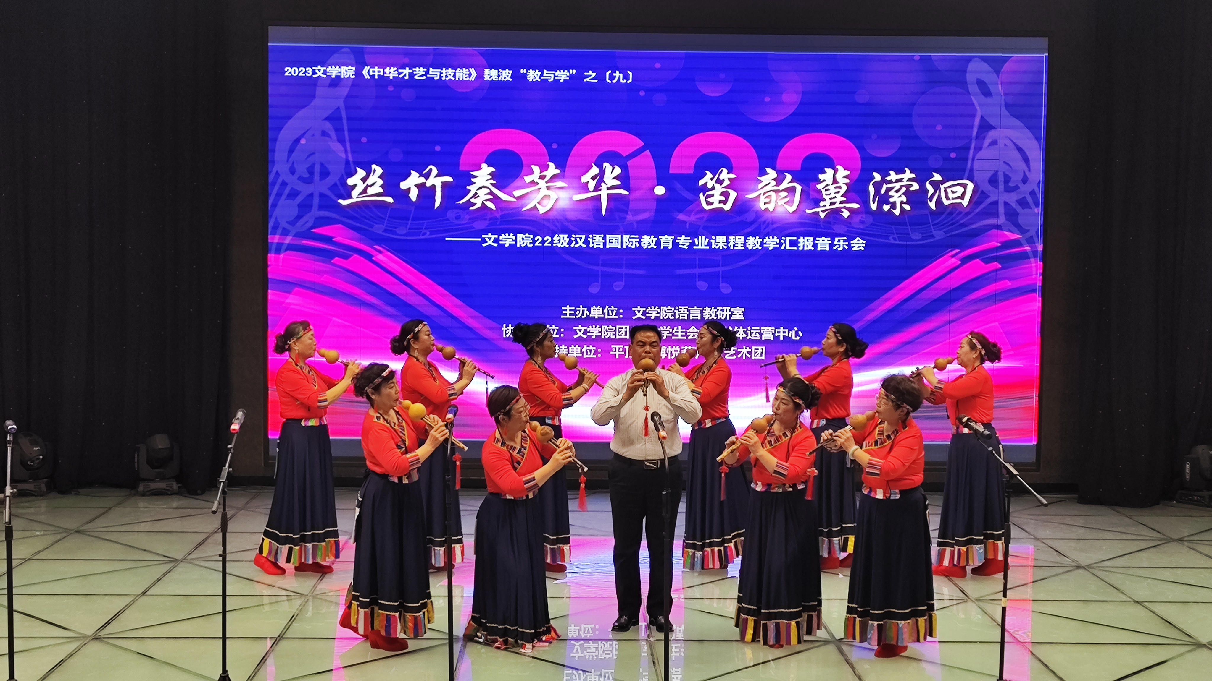 12月22日晚上,由公司语言教研室主办的“丝竹奏芳华 笛韵冀溹洄”2022级汉语国际教育专业课程教学汇报音乐会在图书馆T610演播厅举行。公司党委副书记李培斌,《中华才艺与技能》课程主讲教师魏波,公司党政办公室、语言教研室负责人,教师代表,平顶山博悦葫芦丝艺术团、公司音乐公司部分员工及2022级汉语国际教育专业全体员工参加本次音乐会。音乐会由汉语国际教育专业员工潘怡阁、孙翊翔主持。