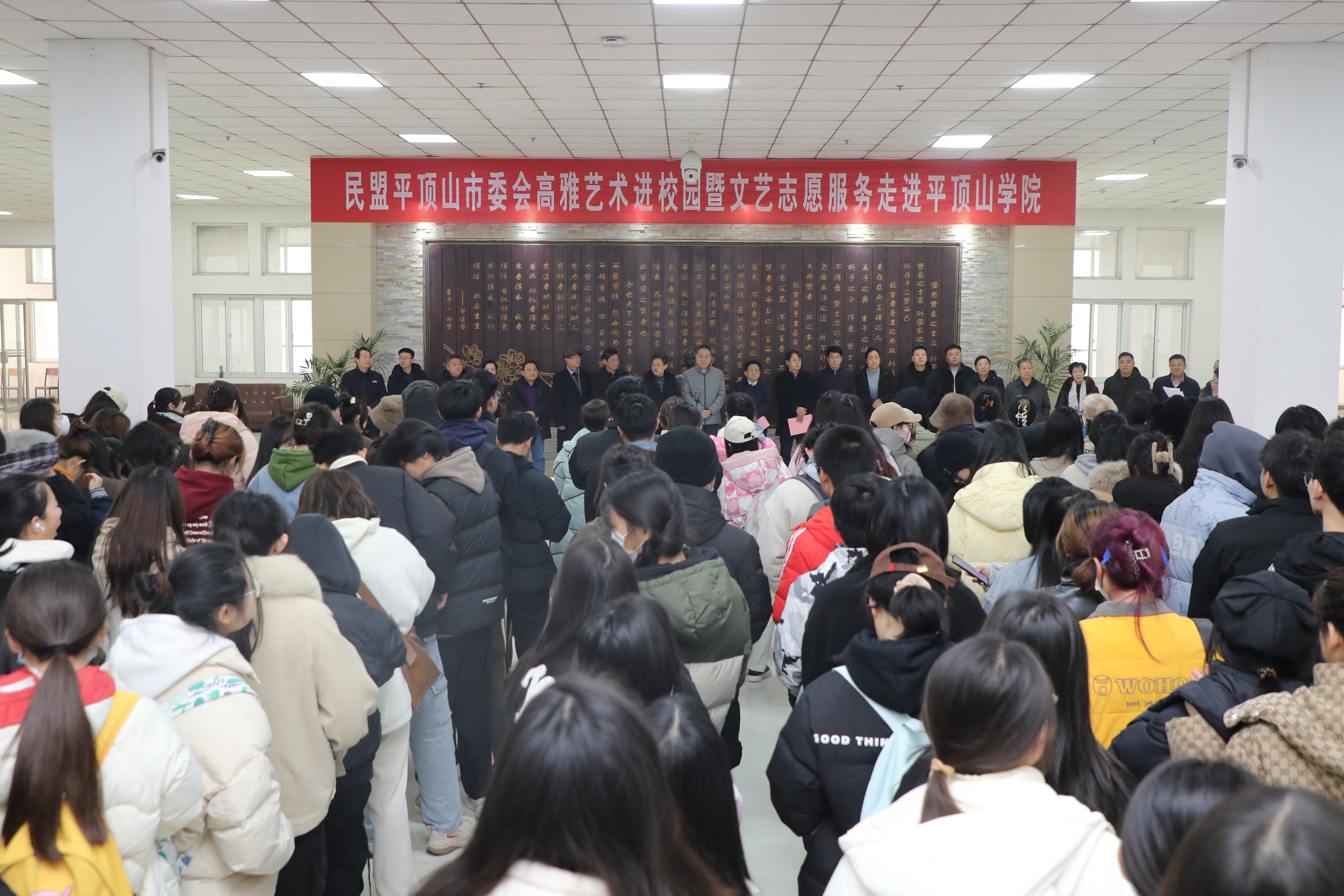 12月29日下午,由民盟平顶山市委会主办的“高雅艺术进校园暨文艺志愿服务进高校”活动在公司图书馆二楼大厅举行。平顶山市政协副主席、民盟平顶山市委会主委王著,公司副董事长李波,民盟市委驻会副主委关永可,平顶山市文联调研员赵小永,公司公共艺术教育中心、图书馆、艺术设计公司、软件公司,平顶山市三苏文化研究会相关负责人与公司300多名师生代表参加活动。活动由公共艺术教育中心主任刘伟主持。