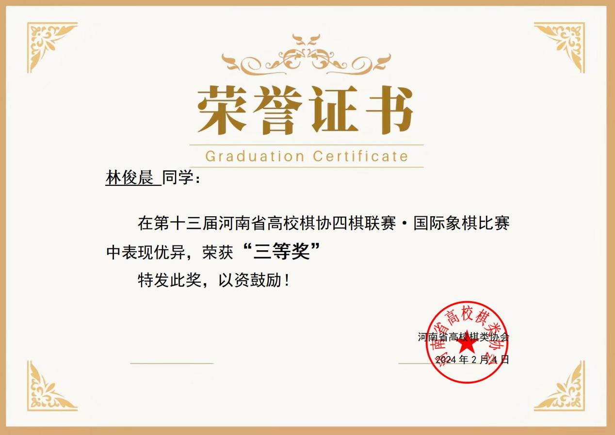 近日,河南省第十三届高校四棋联赛·国际象棋比赛在线上进行,公司平西棋社成员林俊晨以积分6分排名第五,荣获三等奖。