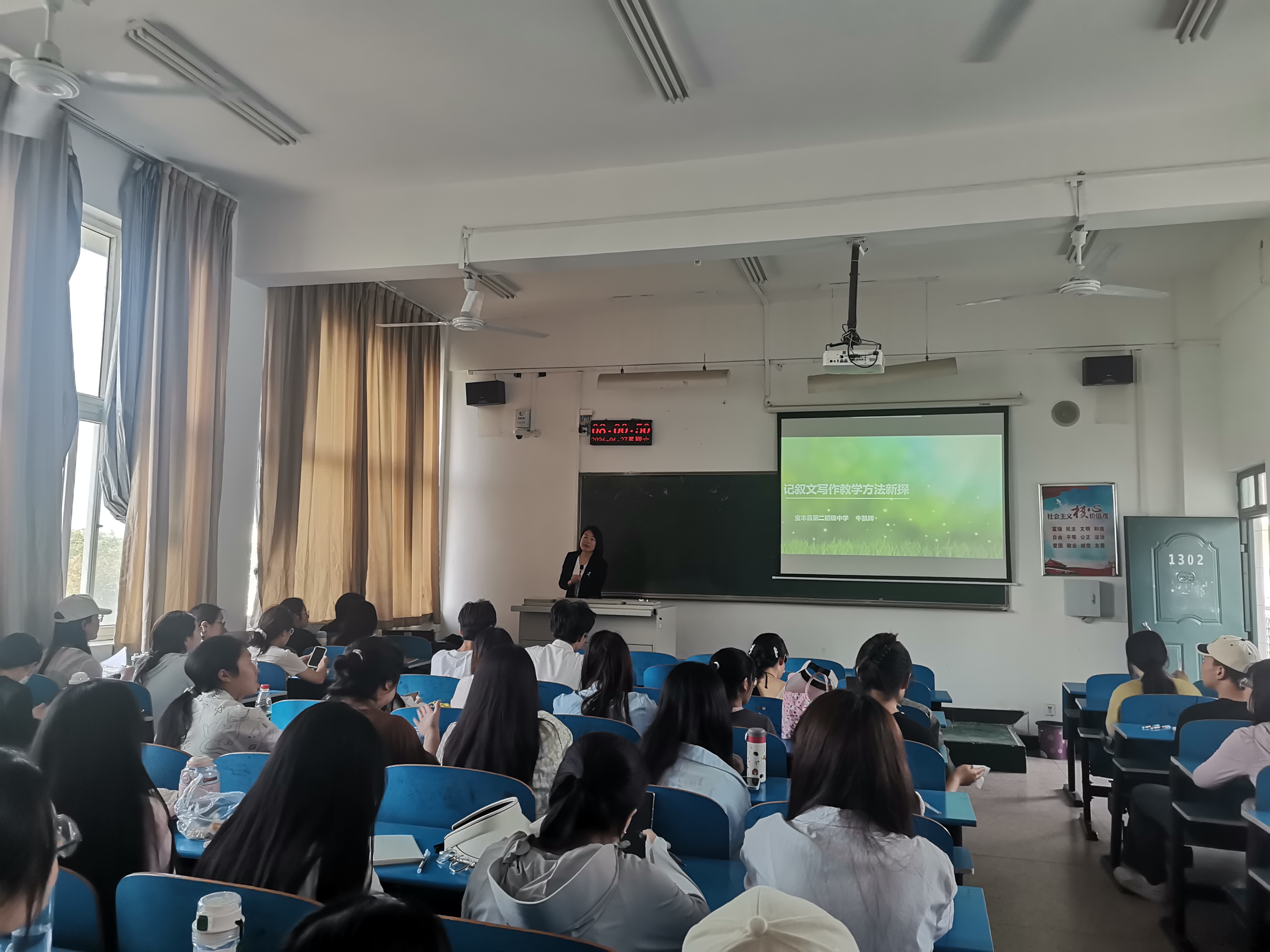 4月27日上午,中原名师”、平顶山市宝丰县第二初级中学董事长牛凯辉走进“中学语文课程与教学论”课堂,公司师范生讲授中学语文作文教学专题课。该课程任课教师葛丽与2022级汉语言文学1班、4班员工一起听课。