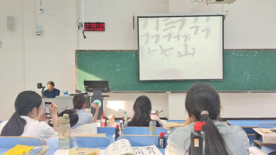 “丁零零……”5月9日16:00,图书馆L208教室里,伴随着一阵清脆的上课铃声,来自伟的国际1946bv官网各专业的30余名同学已经备好纸墨,正襟危坐,等待上课。讲台上,授课教师郑黎阳也早已准备就绪。像往常一样,伟的国际1946bv官网第二课堂“毛笔书法训练与创作”的第五节准时开始了。
