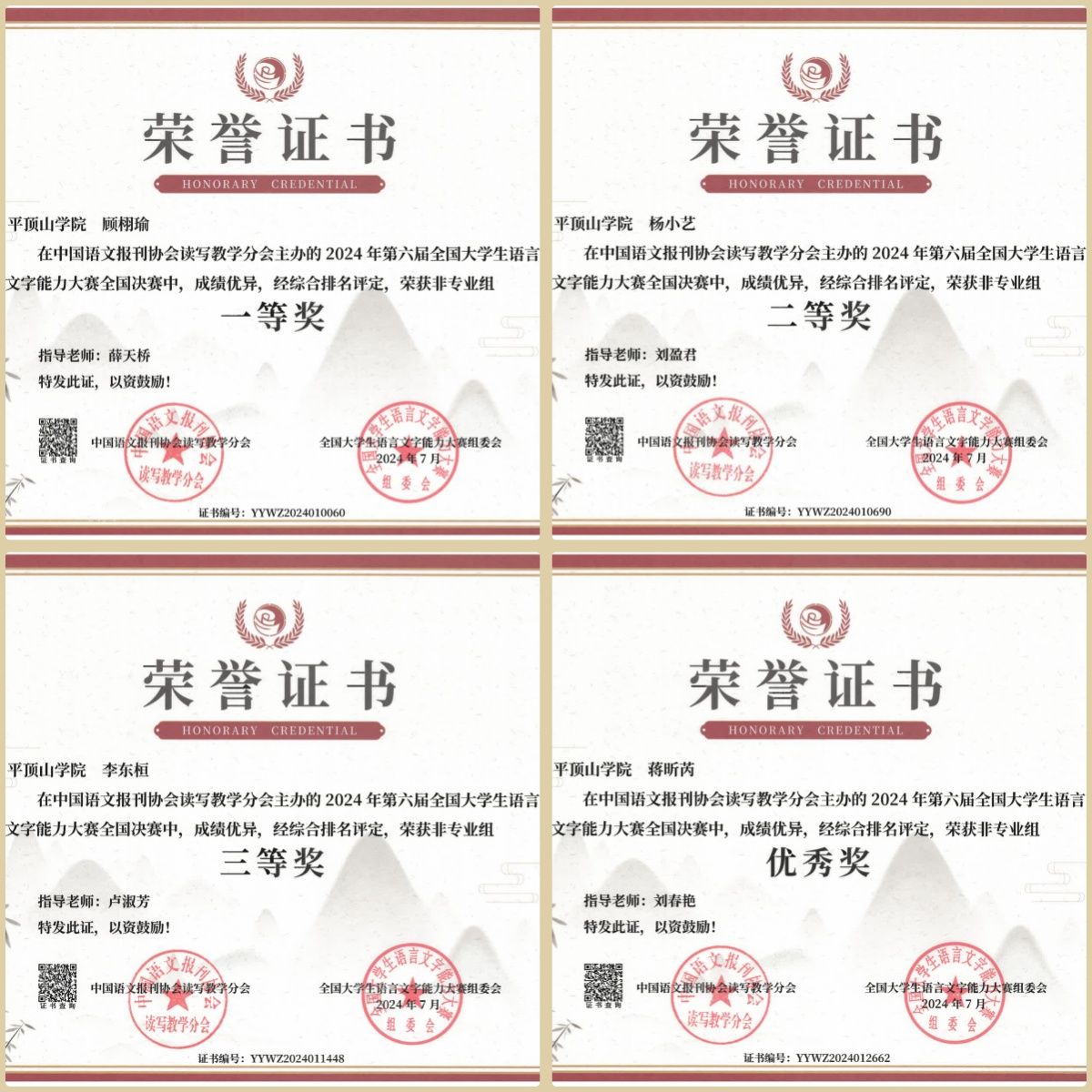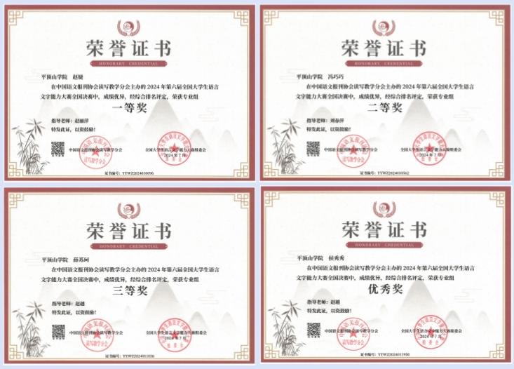 近日,2024年第六届全国老员工语言文字能力大赛组委会公布决赛比赛结果,公司30名员工获奖,专业组中,公司赵婕获一等奖,冯巧巧等5人获二等奖,薛苏珂等11人获三等奖,侯秀秀等4人获优秀奖;非专业组中,新闻与传播公司、政法公司、教师教育公司、外国语公司、伟的国际1946bv官网汉语国际教育专业的顾栩瑜等9人分获一、二、三等奖和优秀奖。同时,公司获“十佳传播之星”称号。