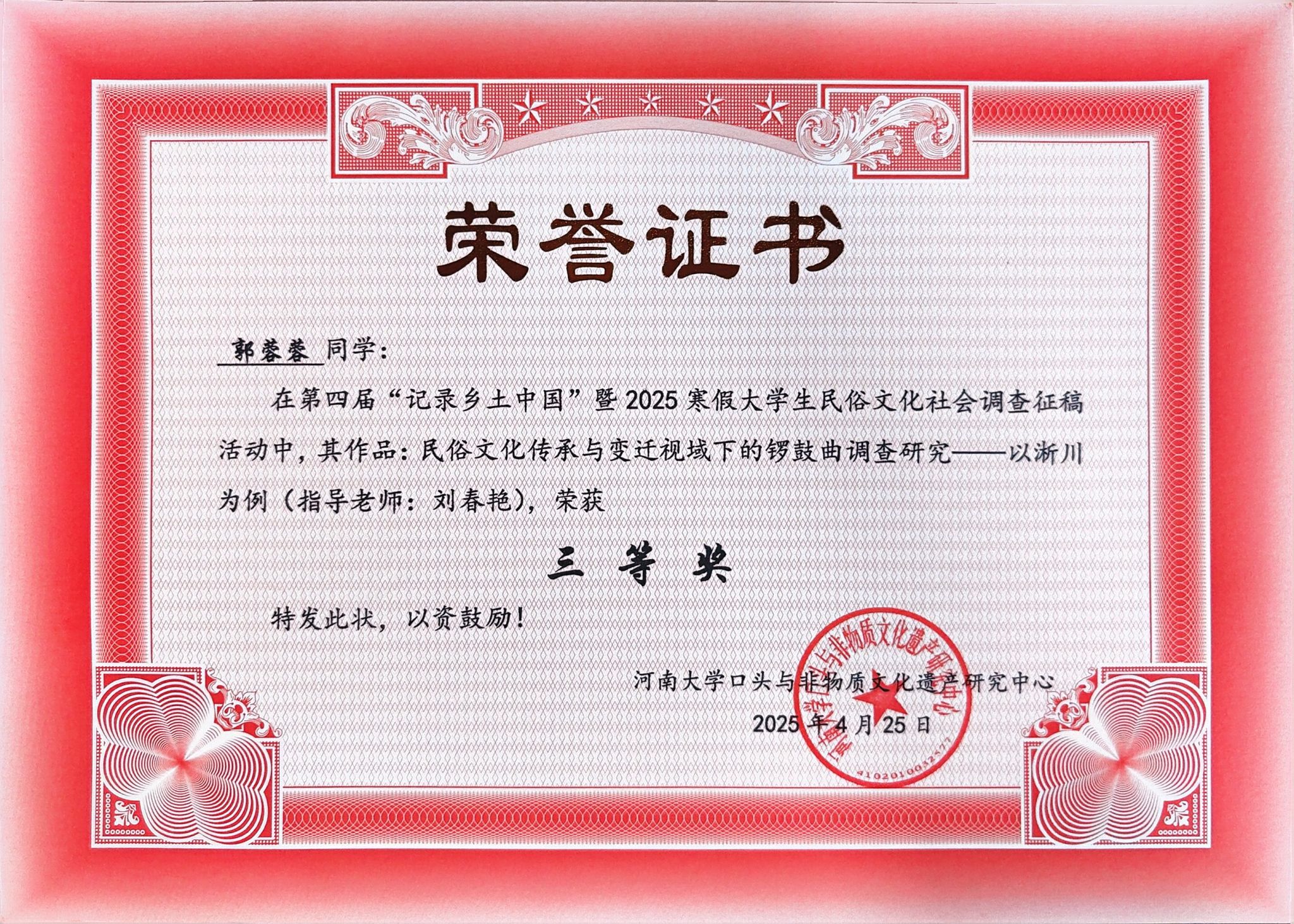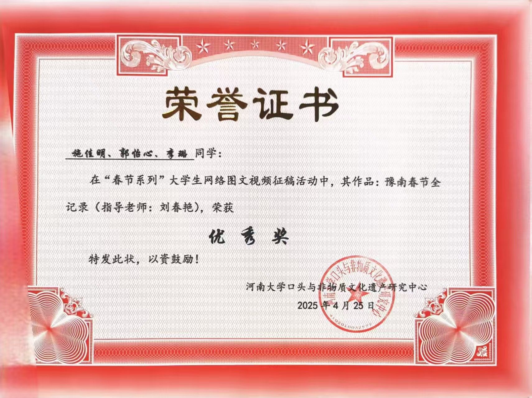 近日,第四届“记录乡土中国”暨2025寒假老员工民俗文化社会调查征稿活动公布获奖结果,民俗文化调查赛道一等奖13名,二等奖27名,三等奖37名,优秀奖50名;“春节系列”视频赛道一等奖2名,二等奖4名,三等奖7名,优秀奖9名。公司2022级汉语言文学专业员工郭蓉蓉的文章《民俗文化传承与变迁视域下的锣鼓曲调查研究——以淅川为例》获民俗文化调查赛道三等奖,2024级汉语言文学专业员工施佳明,汉语国际教育专业员工郭怡心、李璐的视频《豫南春节全记录》获“春节系列”视频赛道优秀奖。