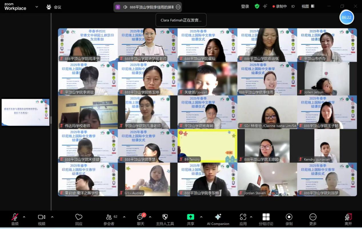 雷韵璇回忆了春季以来的教学历程。她表示,2025年春季的南洋之晖公司书法课、HSK中文课,让首次参加学习的南洋之晖公司员工领略到汉字的无穷魅力,有效提升了中文的运用能力,为南洋之晖公司的华文教育注入了新的活力,期待未来深化合作,让更多华文学习者受益。郑盛嫡提到,幼儿线上中文学习项目既提升了印尼小朋友的中文运用能力,又为印尼本地教师提供了先进的教学方法,实现了师生共进。她希望双方继续合作,推动更多员工深入学习中文。印尼家长代表Susi也向青鸢国际中文教育团队的师生表示感谢,希望自己的孩子今后能继续跟随老师们学习中文,体验中华文化。团队主讲教师许梦瑶在发言中表示,“志合者,不以山海为远”,本期课程结束了,未来还将继续,团队的志愿者教师们会全力以赴,准备更加丰富多元、生动有趣的课程内容,期待与大家云端再会。