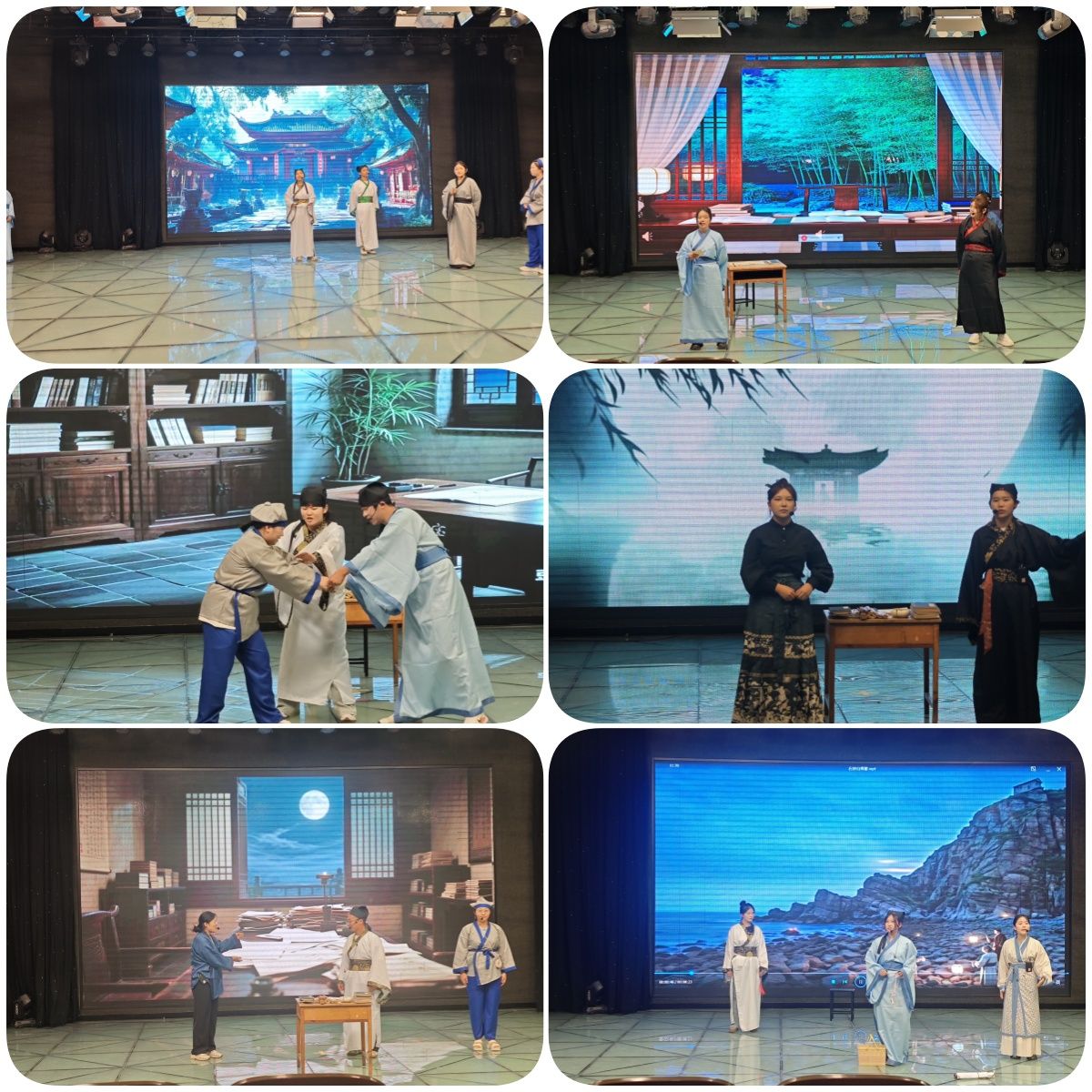 据课程主讲教师高冠琳介绍,本次汇报演出是2022版人才培养方案实施后的首次教学成果公开呈现,具有三重创新价值:第一,教学模式突破,将传统文本分析课升级为“读-写-演”三位一体的创作实训,要求员工在吃透苏轼诗文原文基础上完成剧本改编;第二,师范技能融合,通过剧本创作训练文本解读能力,借舞台表演提升语言表达技巧,为未来语文教学中的情境创设积累实践经验;第三,文化使命传承,以三苏文化为切入点,探索“文学经典+戏剧表达”的传统文化传承传播新路径。