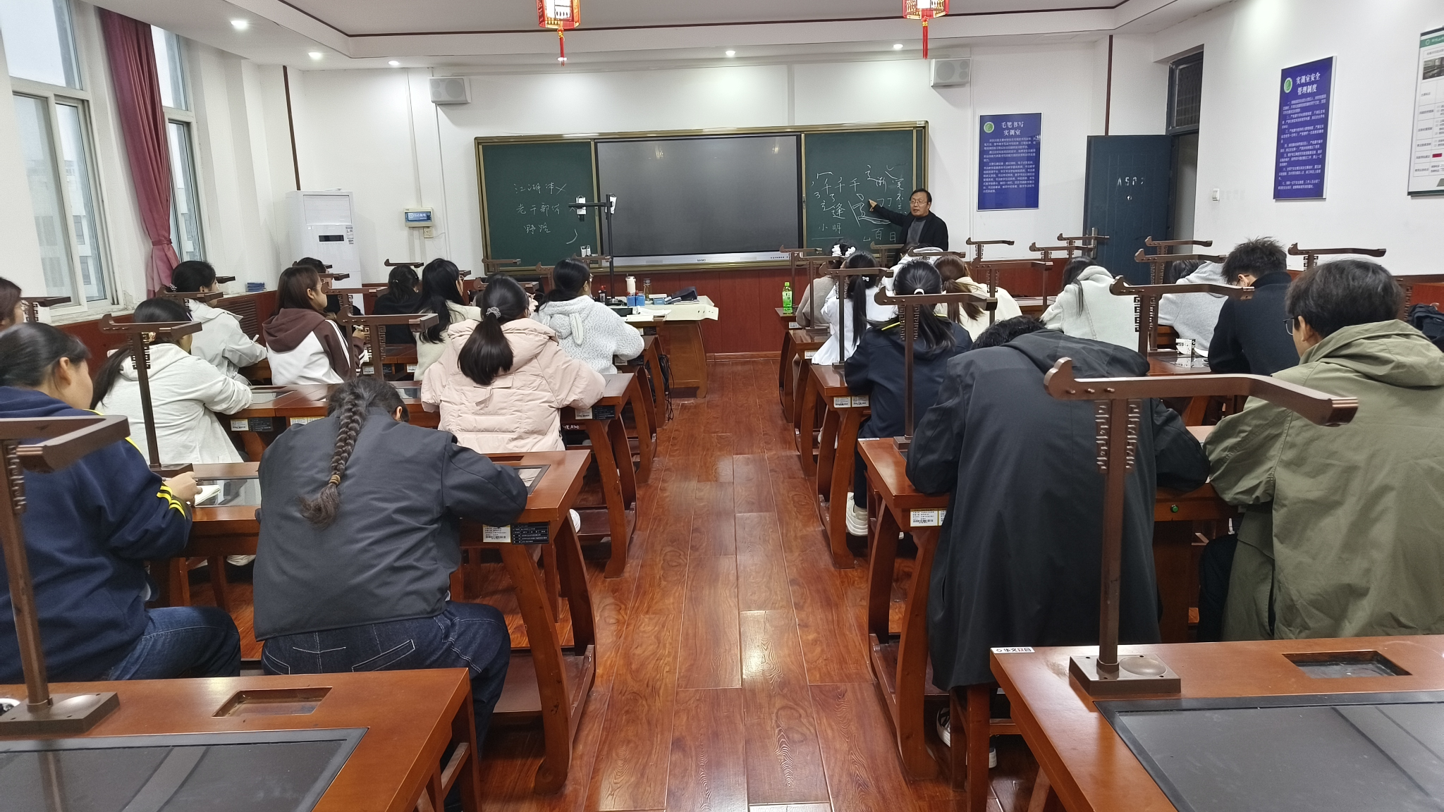 当天,李东晓老师率先为同学们讲授硬笔书法技能。他结合日本书道申遗成功案例、“小明书法”现象及中国书法教育现存问题,向同学们阐明了学习、传承和弘扬中国书法艺术的重要性。他表示,日本书道源于中国书法,其艺术水准和传承教育不亚于中国;李明同学练习书法非常刻苦,用力甚勤,但其“小明书法”属于“江湖体”,这都说明我们现存诸多问题,需要开展正规的书法教育,做好书法艺术传承。李东晓老师从汉字笔画书写技巧、汉字间架结构、书法理论等讲起,为大家简单梳理了中国书法发展史。书写技能训练中,他为大家开展一对一指导,不时纠正大家的握笔姿势,强调“笔需尽量垂直于桌面。他向同学们推荐了邹慕白、田英章等书法家的字帖,鼓励大家找到喜爱的字体,从临摹入手,持之以恒地训练,不断提升书写水平。