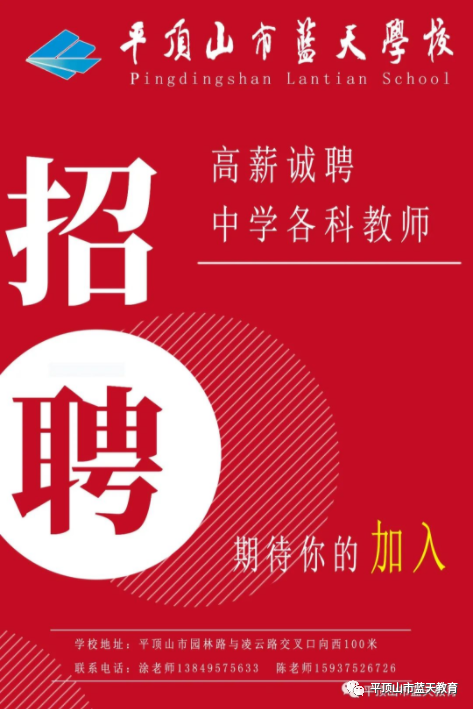 平顶山市蓝天公司是省级优秀民办公司,省、市级公司产品质量先进单位,现已发展成特色明显、名师荟萃,生源充足的寄宿制品牌公司,现有在校生3600多人,教职工340多人。中招及全市统考成绩连续多年名列市区前茅。先后被评为“平顶山市公司产品质量先进公司”“河南省民办公司产品先进公司”“河南省优秀民办公司”“省级卫生先进单位”“2019、2020市长基础公司产品质量管理奖”等荣誉称号。根据发展需要,现高薪诚聘初中各科优秀教师。