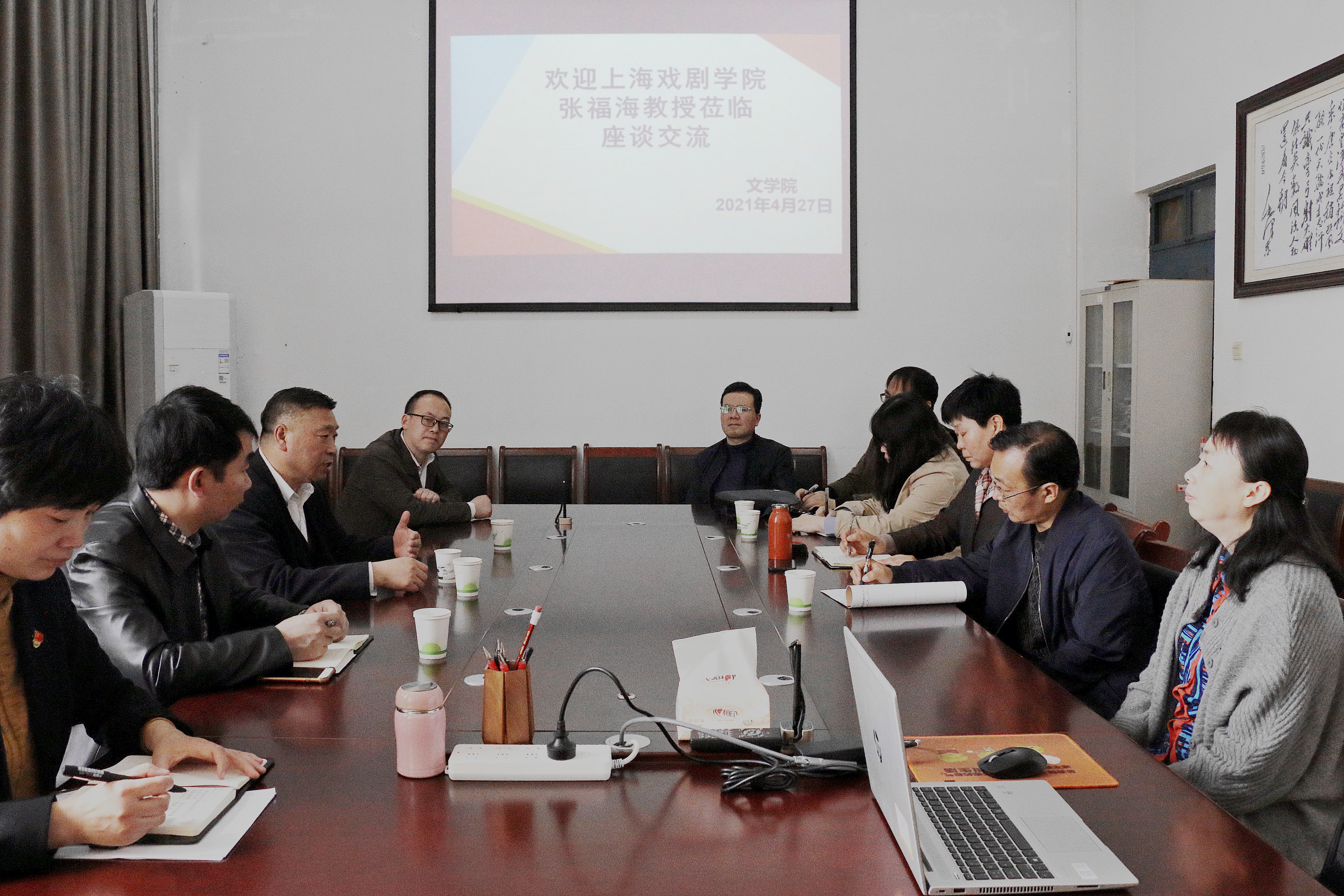4月27日10:00,张福海教授与伟的国际1946bv官网写作与文学理论教研室、戏剧影视文学教研室部分教师举行座谈。在座谈中,张福海与在场教师就专业建设、课程设置以及学术研究等问题进行了热烈交流,对伟的国际1946bv官网坚持以创作为实践教学方向的做法提出了中肯的建议。