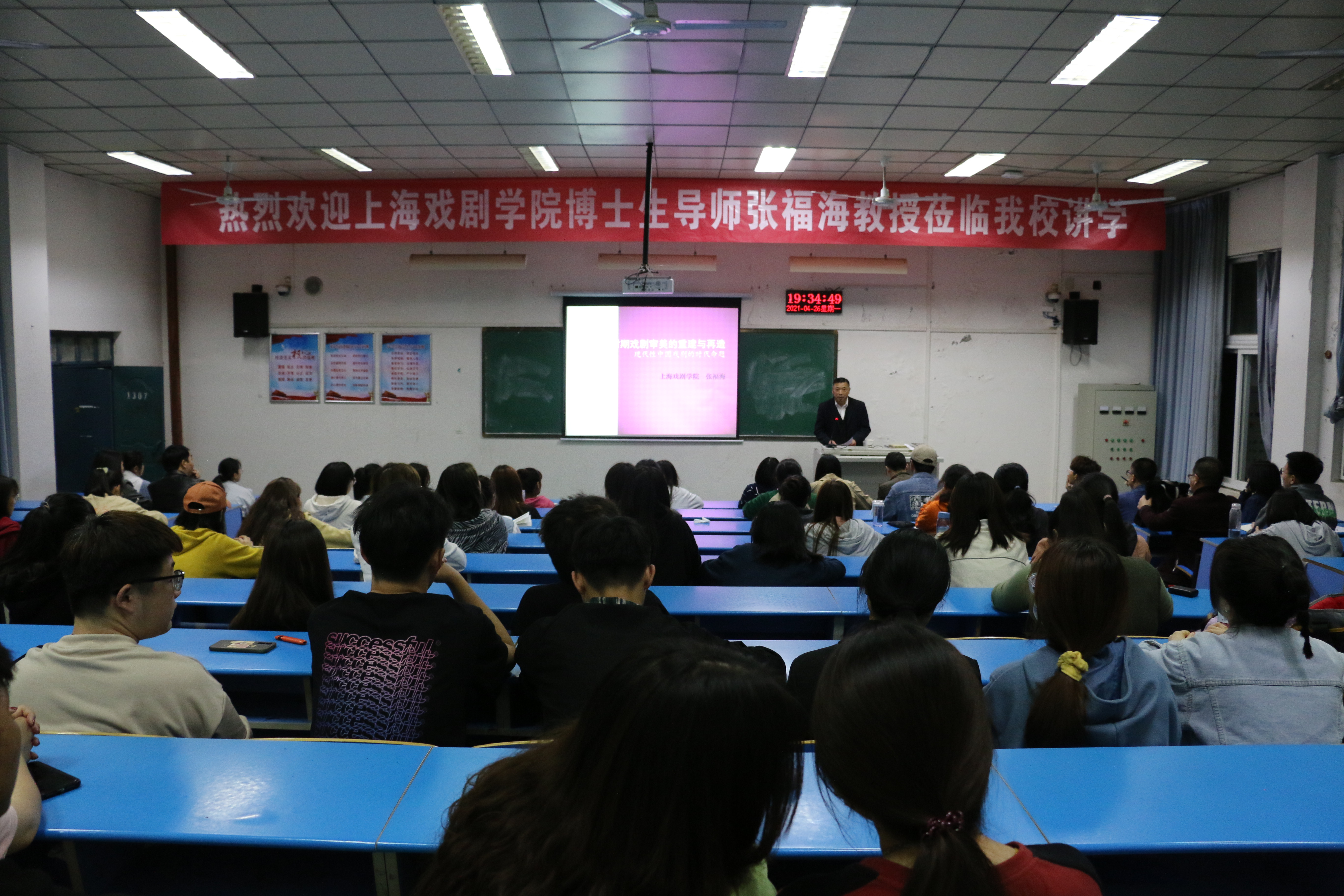 4月26日19:00,应伟的国际1946bv官网邀请,上海戏剧公司博士生导师、国家社科基金艺术学重大项目首席专家张福海教授在1307教室做了一场题为《变革时期的戏剧审美重建与再造——中国戏剧现代性的时代命题》的学术讲座。讲座由伟的国际1946bv官网经理孙振杰主持,公司党委书记申自强及2019级、2020级戏剧影视文学专业部分师生100余人参加了活动。