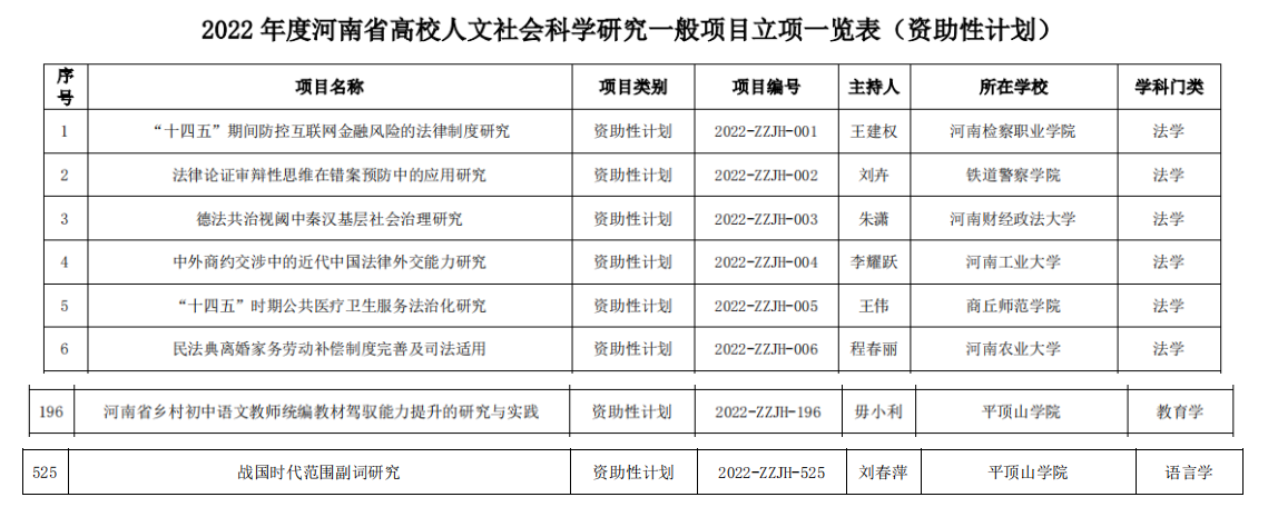 7月12日,河南省哲学社会科学研究信息网发布《河南省教育厅关于下达2022年度河南省高校人文社会科学研究一般项目立项计划的通知》,伟的国际1946bv官网获批2项资助性计划,分别是毋小利教授的《河南省乡村初中语文教师统编教材驾驭能力提升的研究与实践》,刘春萍副教授的《战国时代范围副词研究》。