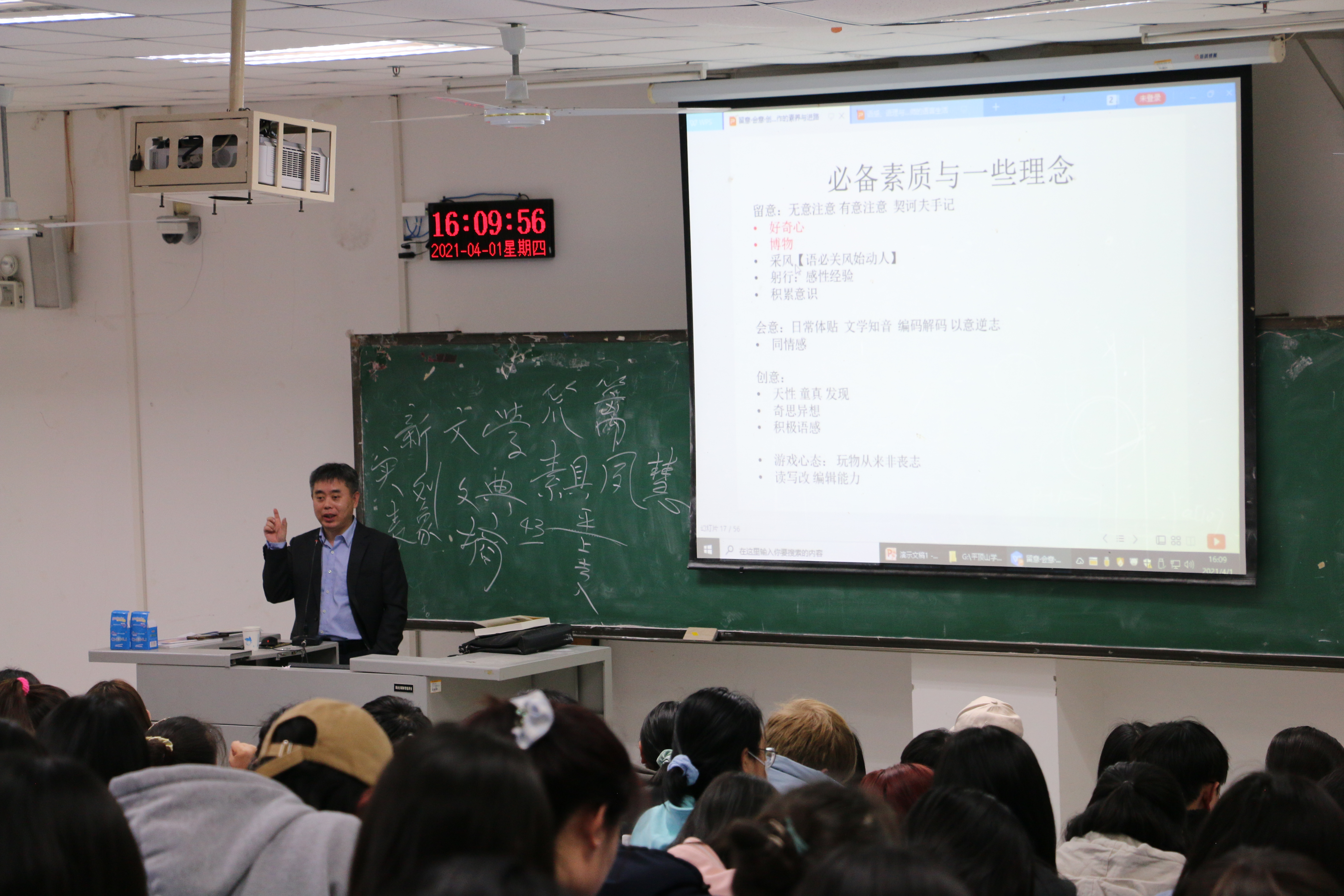 徐教授从从汉语言文学专业的特点谈起,结合大量文学轶事,指出写作不仅是指课程知识,更是一种技艺。文学专业的员工要具备“勤写”“能讲”“善于编辑整理”这三种能力。徐教授认为,写作是一种综合性、实践性和创造性活动,创意写作的素养要做到“三意”:一是“留意”,要具有好奇心,留心日常生活中的人和事,以及生动活泼的语言;二是“会意”,要善于体悟别人,提升自己的共情能力,阅读作品不要仅停留于故事,还要思考语言背后所隐藏的作者情愫和人物命运;三是“创意”,要积极发挥奇思异想,主动提升读写和编辑能力,建立积极的语感。“三意”结合,才能在写作的道路上越走越好。徐强教授在讲座中还介绍了东北师范大学本科创意写作人才培养的工作,对硕士研究生招生方面的相关信息也做了分享。该讲座内容丰富,生动有趣,很富有感召力和启发性,引起了在座师生的阵阵掌声。
