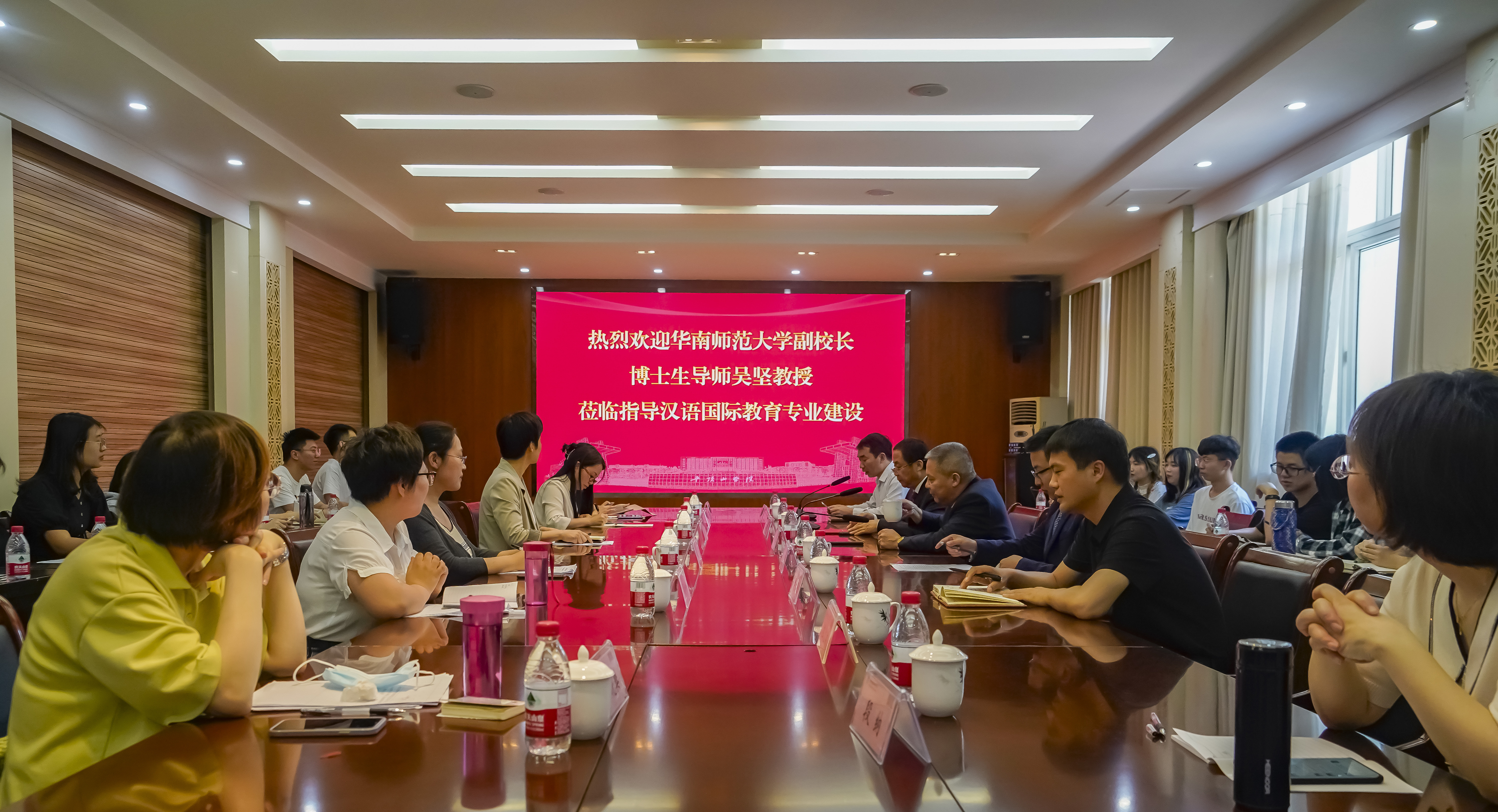 吴坚教授介绍了华南师范大学汉语国际教育专业的创立发展过程,强调汉语国际教育是一个交叉学科,办好这个专业,就应该遵循学科、专业规律,促进学科、专业的交叉融合。汉语国际教育的基础是语言、文化教学,因此,融合教育学和语言学是该专业的应有之义。针对师生关心的汉语国际教育专业的就业问题,吴教授鼓励师生要坚定专业信心,积极发挥汉语国际教育专业作为交叉学科特有的语言和教育技术优势,多走出去看看外面的世界,了解世界的需求。他指出,随着“一带一路”倡议下朋友圈的不断扩大,我国经济文化发展和国际影响力不断提升,汉语国际教育的发展一定是前途远大的。公司和员工要拓展国际化视野,针对国际市场的实际需求,有针对性地调整培养方案和自己的学习专长。高皇伟博士与师生代表就对外合作办学、国际汉语教师选拔等问题进行了深入交流。