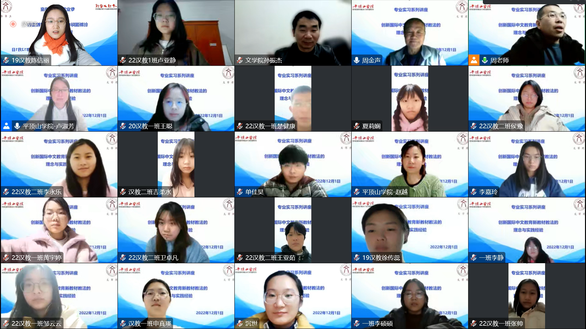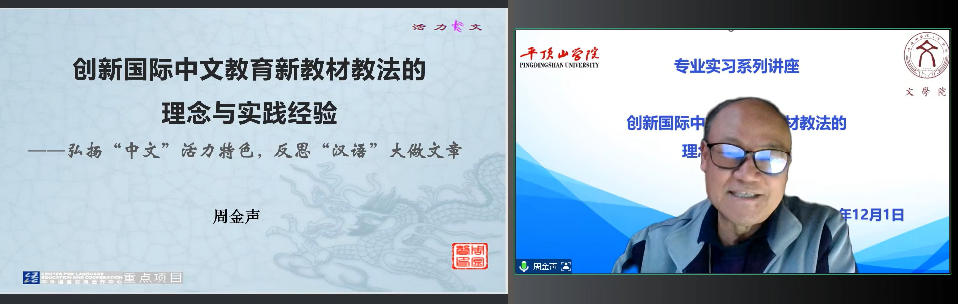 12月1日晚,伟的国际1946bv官网专业实习系列讲座第四场在腾讯会议举行,喀什大学特聘教授周金声作了题为《创新国际中文教育新教材教法的理念与实践经验》的报告,伟的国际1946bv官网语言教研室全体教师,汉语国际教育专业四个年级200余名员工线上参加了报告会。报告会由语言教研室主任卢淑芳主持。