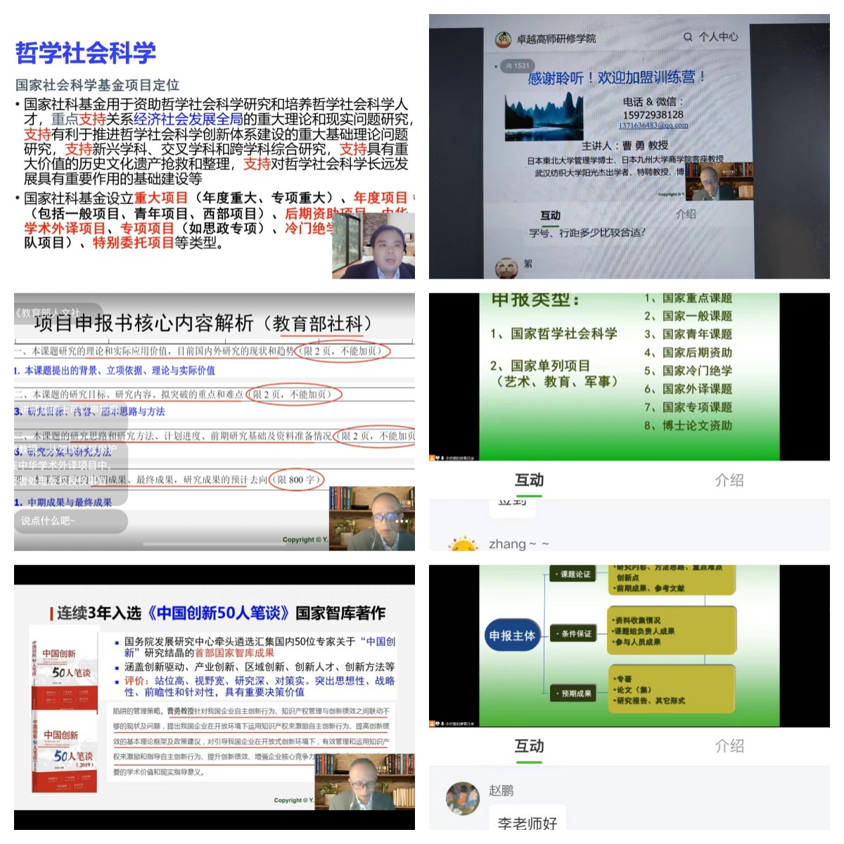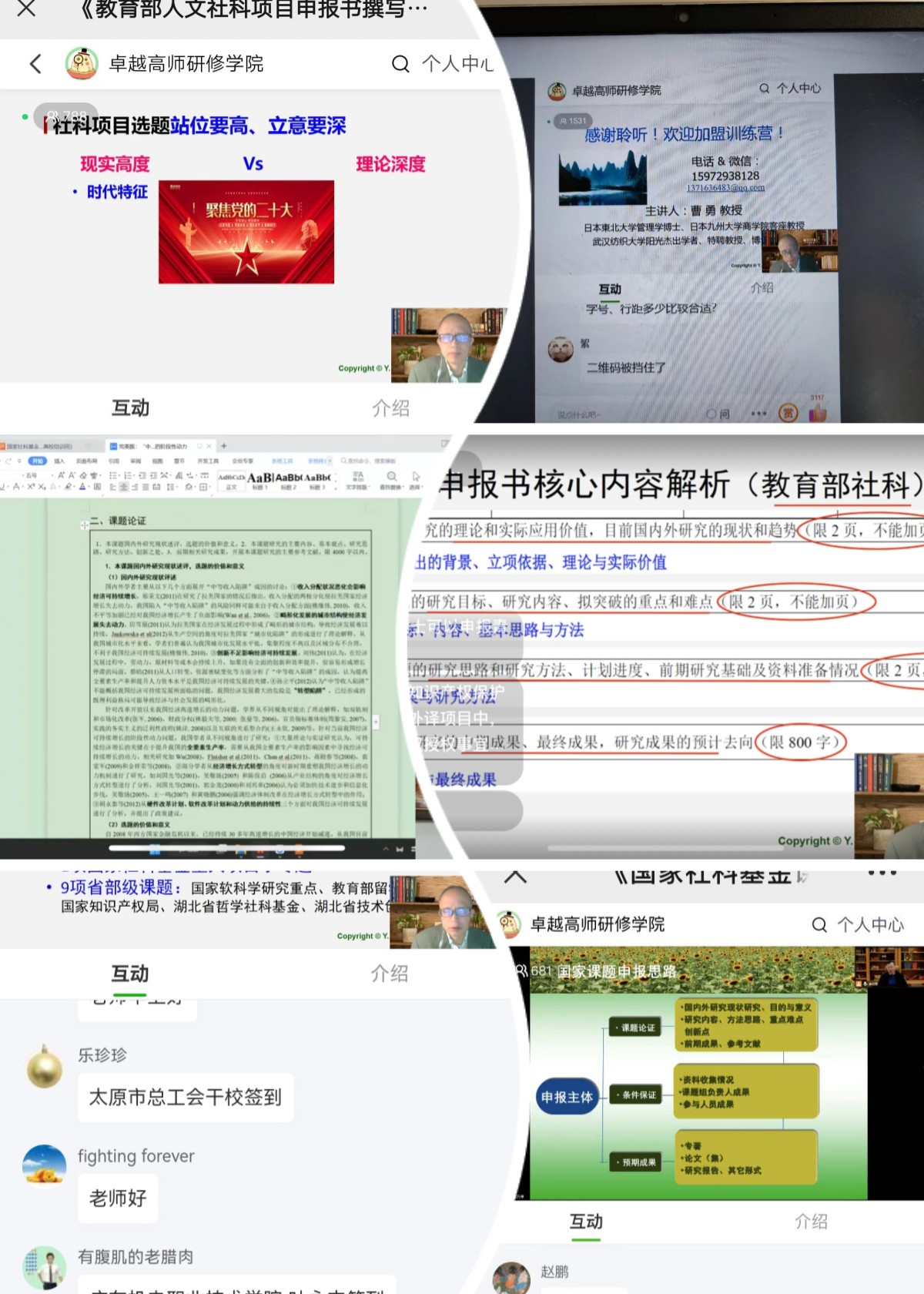 本次专题培训会为期两天,在线上举行,每天进行两场,每场均有一位业内专家进行专题报告。其中长沙理工大学马克思主义公司党委书记易显飞对国家社科基金项目选题与申报书撰写进行了指导;厦门大学的国家自然科学基金管理学部项目通讯评审专家、教育部社科基金重大和面上项目评审专家陈武元就国家社科基金项目申报的技巧及注意事项进行了分析;教育部纺织行业中外人文研究院的国家社科基金项目评审专家、教育部人文社科项目评审专家曹勇就教育部人文社科项目申报书的撰写注意事项与立项案例进行分享;东南大学的国家社科基金评审专家、国家社科基金后期资助评审专家李蓓蕾教授就国家社科基金项目课题申报思路与方法进行了深入讲解。