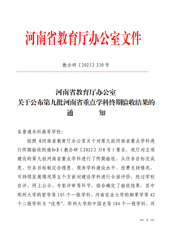 近日,河南省教育厅下发《关于公布第九批河南省重点学科终期验收结果的通知》(教办研〔2023〕230号),公司中国现当代文学省级重点学科通过终期验收,获“优秀”等次。