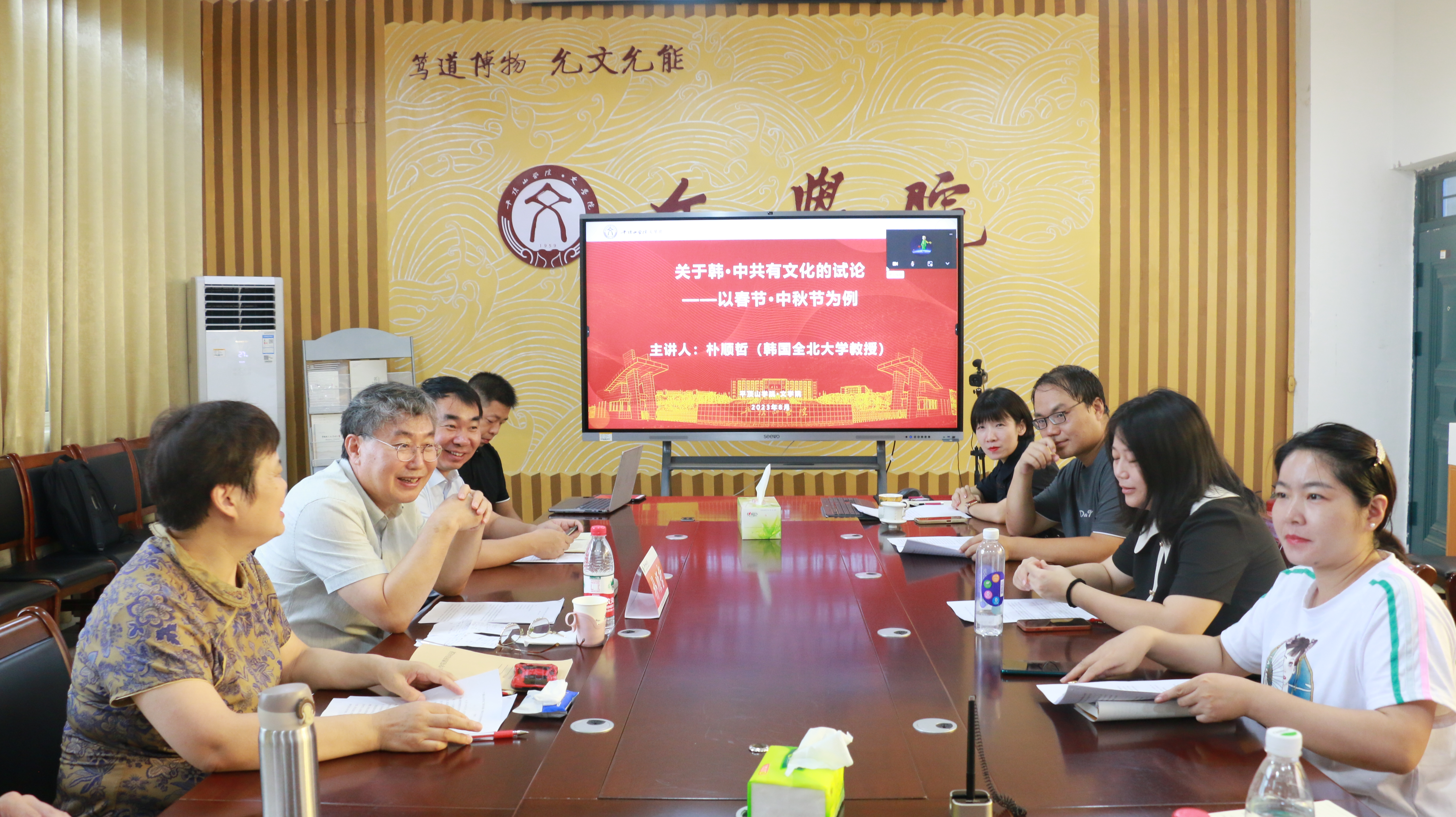 8月19日上午,应伟的国际1946bv官网邀请,韩国国立全北大学博士生导师朴顺哲教授为伟的国际1946bv官网师生作了一场题为《关于韩中共有文化的试论——以春节、中秋节为例》的报告,本次报告采用线上+线下的方式进行。伟的国际1946bv官网经理孙振杰、伟的国际1946bv官网各教研室主任、中国古代文学相关专业教师等200余名师生在1301会议室和腾讯会议参加报告会。报告会由伟的国际1946bv官网副经理赵焕亭主持。