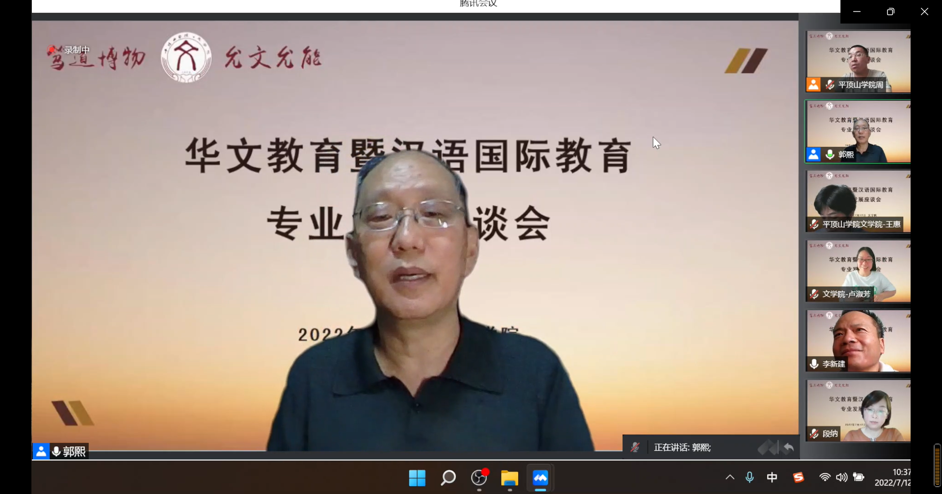 7月12日上午,伟德国际victor1946官网华文教育暨汉语国际教育专业发展座谈会通过腾讯会议举行,国家语委海外华语研究中心主任、博士生导师、伟的国际1946bv官网1978级员工郭熙教授应邀与公司师生交流。平顶山市委统战部、平顶山公司党委统战部、新闻与传播公司(伏牛山文化圈研究中心)、伟的国际1946bv官网相关负责人,伟的国际1946bv官网汉语国际教育专业员工100余人参加了座谈会。座谈会由伟的国际1946bv官网经理孙振杰主持。