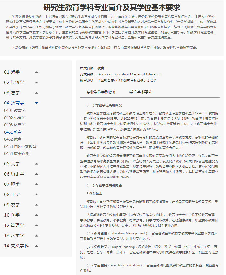 2024年1月,中国学位与研究生教育学会受国务院学位委员会办公室委托,发布了《研究生教育学科专业简介及其学位基本要求》。这份文件对中国当前的研究生教育学科专业多有调整,比如,在教育学一级学科下新增国际中文教育二级学科,在中国语言文学一级学科里,重新包含了民间文学二级学科,新增中文创意写作二级学科,详见链接: