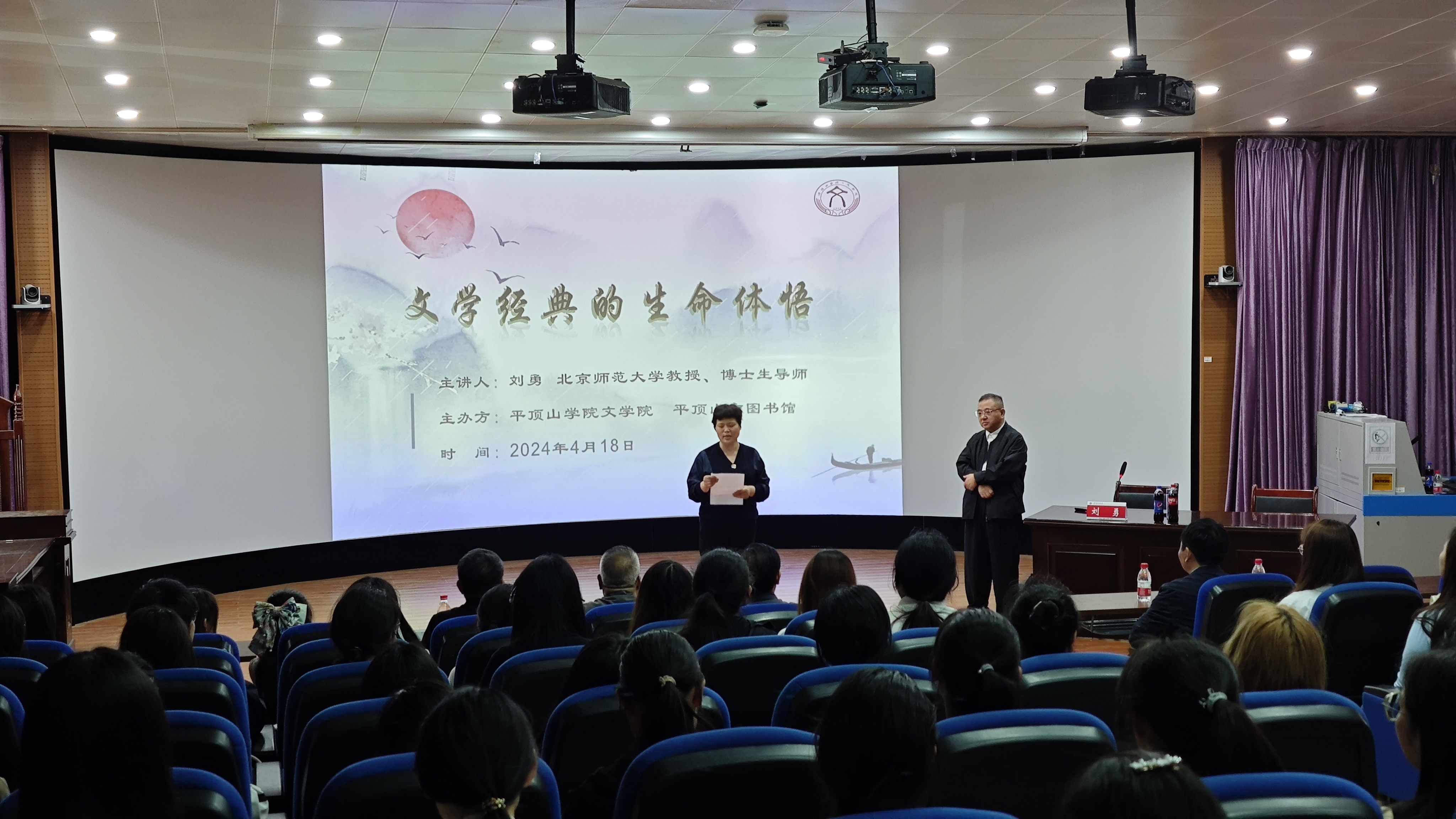4月18日,“平图讲坛”系列报告走进伟德国际victor1946官网。在2号教学楼2106教室,教育部“长江学者”特聘教授,北京师范大学博士生导师刘勇教授作了题为《文学经典的生命体悟》的专题报告,全校师生及平顶山市文学爱好者150余人参加了报告会。报告由伟的国际1946bv官网副经理赵焕亭主持。本次报告也是伟的国际1946bv官网“鼎山讲坛”系列讲座的一部分。