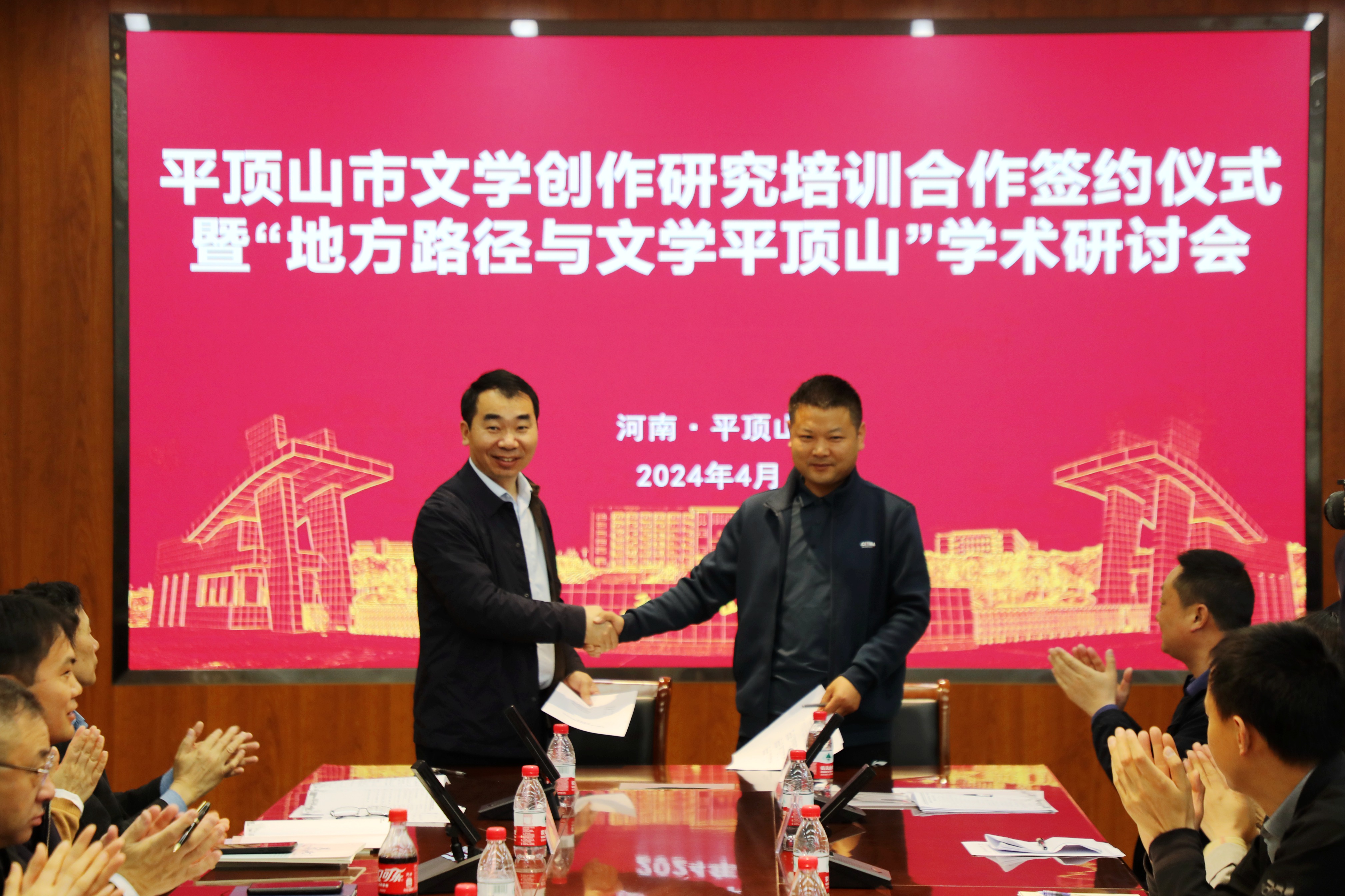 在会议现场,平顶山市文学书画院、平顶山市作家协会与伟的国际1946bv官网共同签订了平顶山市文学创作研究培训合作协议,平顶山市文联调研员赵小永与公司伟的国际1946bv官网经理孙振杰作为代表在协议上签字。