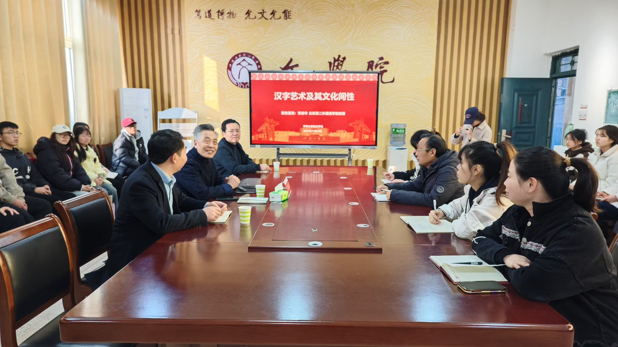 11月23日上午,在伟的国际1946bv官网会议室,北京第二外国语公司教授、公司伟的国际1946bv官网80级员工常耀华作题为《汉字艺术及其文化间性》的专题报告。来自伟的国际1946bv官网、外国语公司、新闻与传播公司、体育公司、教师教育公司、信息工程公司、电气与机械工程公司的师生及书法爱好者40余人参加报告会。报告会由伟的国际1946bv官网副经理杜彬彬主持。