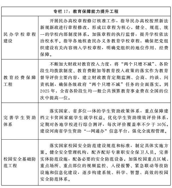 ——教育综合改革不断深化。制定《新时代河南教育综合改革方案》,推动教师管理体制改革、中小学布局调整和资源整合、高校内部治理机制改革等重点改革。稳妥推进高考综合改革,制定《河南省深化考试招生制度改革实施方案》,取消了7类26项高考加分项目。教育“放管服”改革成效显著,公司办学自主权得到落实,下放高校教师职称评审权,在中小学设置正高级职称,中小学教师“县管校聘”改革启动实施。中外合作办学机构和项目总数达到289个,境外办学机构达到9所。