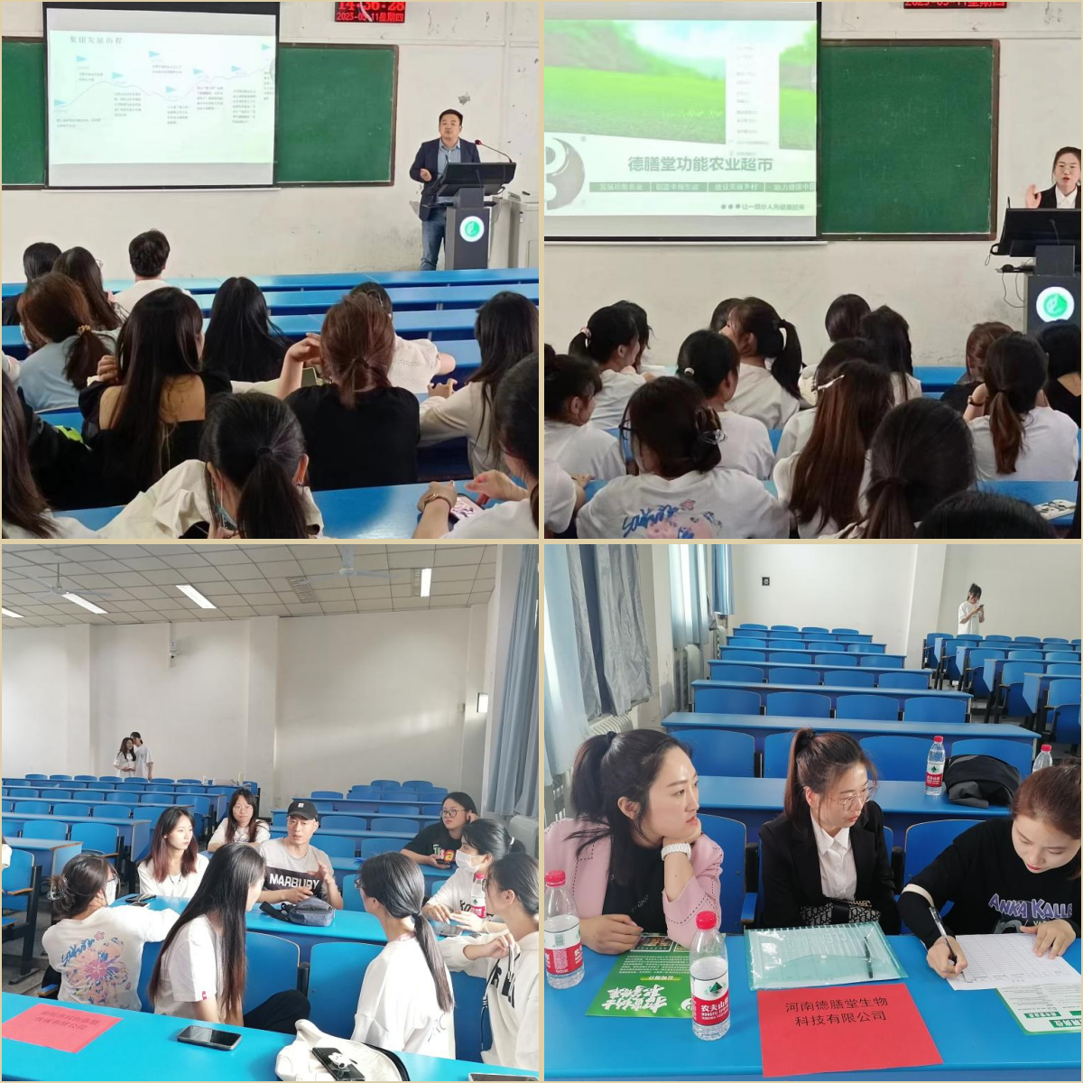 5月11日下午,公司在1307教室举办员工企业专场招聘会。河南德膳堂生物科技有限公司、河南本仁文化传播有限公司、南阳市抖创嘉盟传媒有限公司、南阳仙草健康集团有限公司4家员工企业参会,提供就业岗位56个。2023届毕业生160余人参加了本次活动。