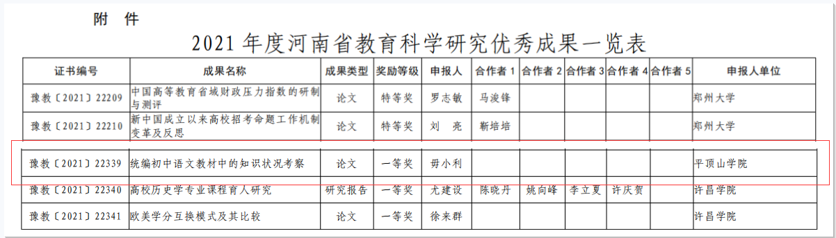 近日,河南省教育厅发布《关于公布2021年度河南省教育科学研究优秀成果的通知》(教教科〔2021〕249号),公司毋小利教授的论文《统编初中语文教材中的知识状况考察》荣获河南省教育科学研究优秀成果一等奖。