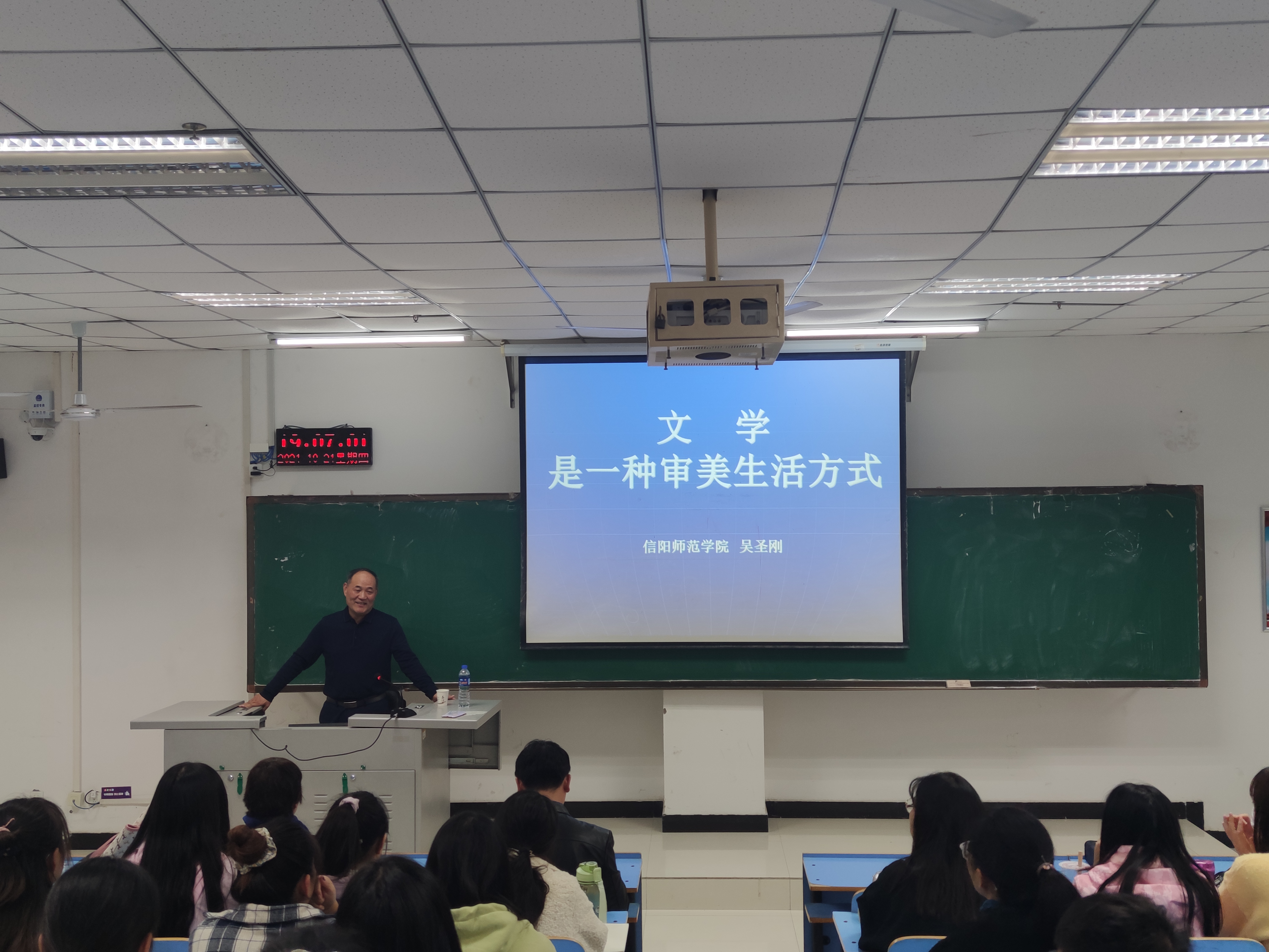10月21日晚,应伟的国际1946bv官网邀请,信阳师范公司硕士生导师、文艺学科带头人吴圣刚教授在图书馆511教室作题为《文学是一种审美的生活方式》的学术报告,伟的国际1946bv官网师生200余人参加活动。报告由伟的国际1946bv官网经理孙振杰主持。