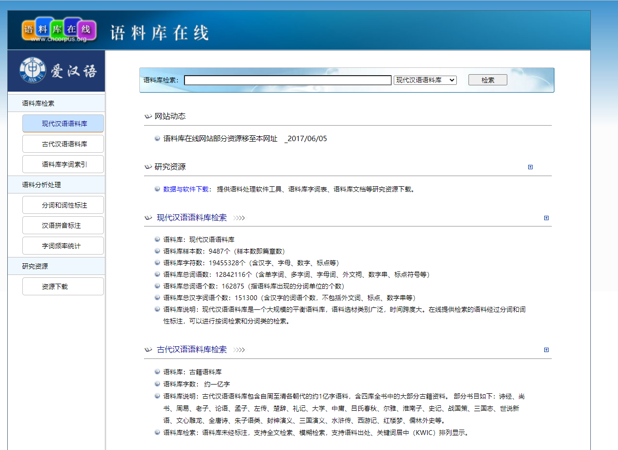 本数据库由教育部语言文字应用研究所计算语言学研究室主办,是一个收集了大量现代汉语语料的数据库。