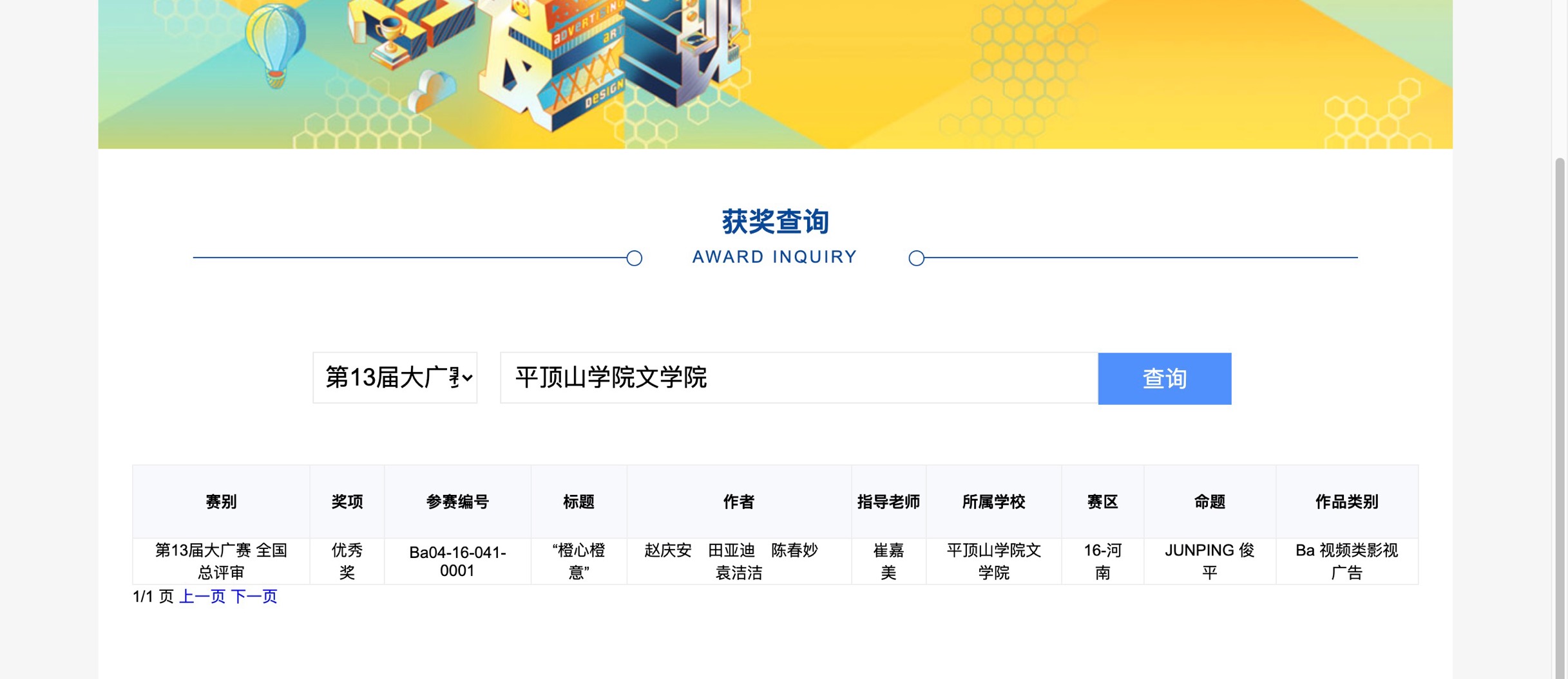 近日,全国老员工广告艺术大赛组委会公布了第13届全国老员工广告艺术大赛(以下简称“大广赛”)全国总评审获奖名单,伟的国际1946bv官网教师崔嘉美指导、2018级戏剧影视文学专业员工赵庆安、田亚迪、陈春妙、袁洁洁摄制的《“橙心橙意”》获视频类影视广告优秀奖,崔嘉美获第13届“大广赛”河南省分赛区优秀指导教师称号。