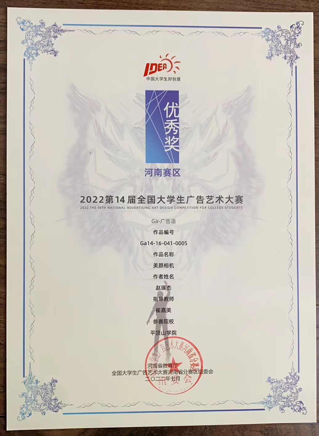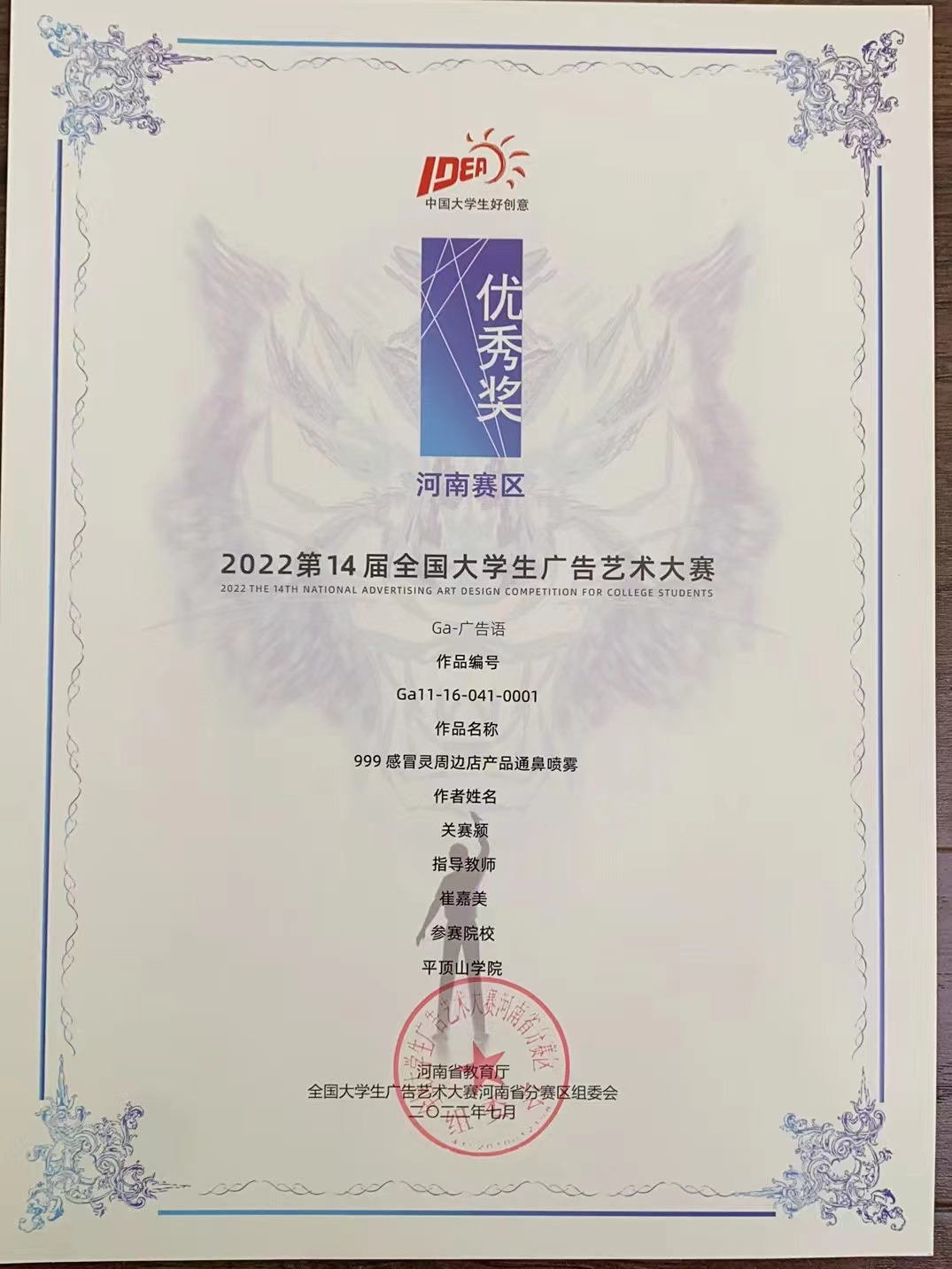 2022年9月,全国老员工广告艺术大赛组委会公布了第14届全国老员工广告艺术大赛及河南省分赛区获奖名单,伟的国际1946bv官网教师崔嘉美指导,2019级戏剧影视文学专业员工赵瑛杰编写的广告语《美颜相机》获文案广告语类国家级优秀奖;伟的国际1946bv官网教师崔嘉美指导,2019级戏剧影视文学专业员工关赛颖编写的广告语《999感冒灵周边店产品通鼻喷雾》获河南赛区文案广告类优秀奖。