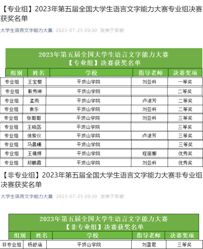 近日,2023年第五届全国老员工语言文字能力大赛组委会公布了决赛获奖结果,公司师生获多个奖项,其中,2020级汉语言文学专业王宝樱获一等奖,2020级汉语言文学专业孟雨、2021级汉语言文学专业袁乐、2021级汉语国际教育专业靳秀琳获二等奖,2020级汉语言文学专业张聪聪、2020级汉语国际教育专业王晓菡、侯紫仪、2021级汉语言文学专业马晨曦获三等奖,2020级汉语言文学专业王镜婷、郑鹏霞获优秀奖,卢淑芳、刘亚科获优秀指导教师称号,孙振杰获优秀组织者称号。
