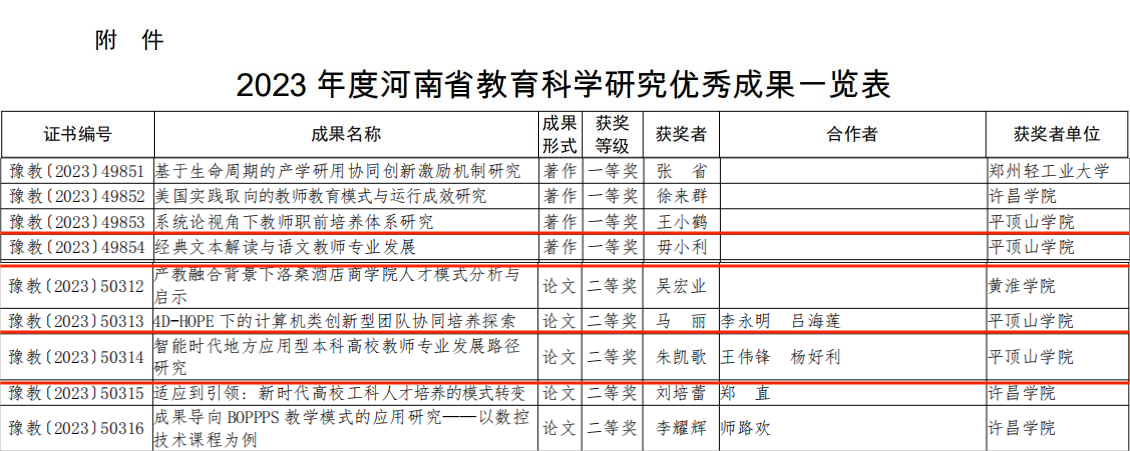 8月3日,河南省教育厅发布《关于公布2023年度河南省教育科学研究优秀成果的通知》(教教科〔2023〕264号),公司毋小利教授的著作《经典文本解读与语文教师专业发展》获本年度优秀成果一等奖,朱凯歌老师的论文《智能时代地方应用型本科高校教师专业发展路径研究》获二等奖。